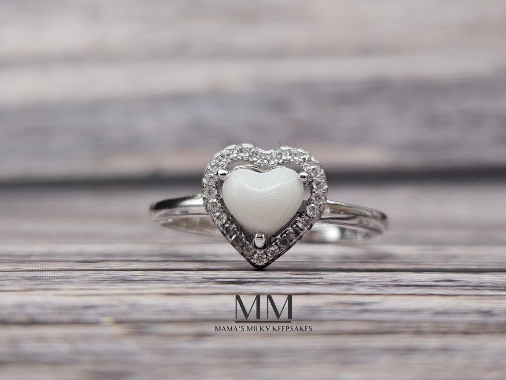 ♡ This ring holds an 8mm heart stone made with your inclusions, this piece can hold anything you want it to hold including breastmilk, ashes, formula, hair, pet hair, pet ashes, (not limited to dogs, cat, horses, send me a message!), gravesite soil, dried flowers, umbilical cord, encapsulated placenta, fabric, etc.