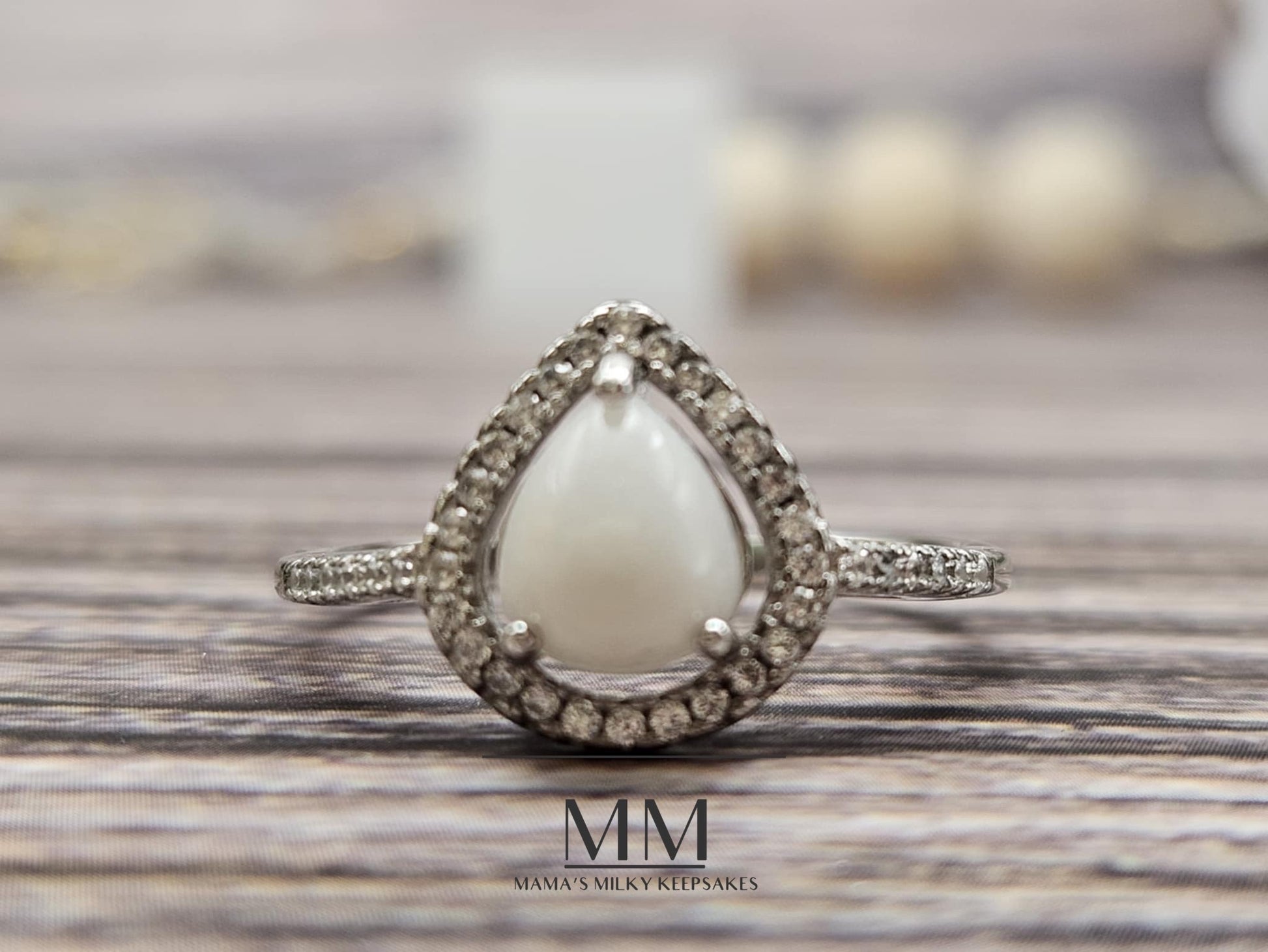 Also know as the Ambrose ring, this ring is set with a 5 mm x 7 mm milk stone. It is made with solid .925 sterling silver dn comes in silver or plated gold and plated rose gold. It's available in sizes 3 to 12 as well as half sizes.