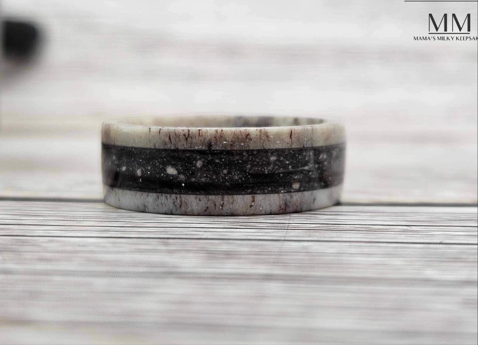 This ring is made from naturally shed deer antler. The ring is ~2 to 2.5 mm thick and 8 mm wide for an optimal comfort fit. The inner channel, where your sentiments are held, is 4 mm wide.