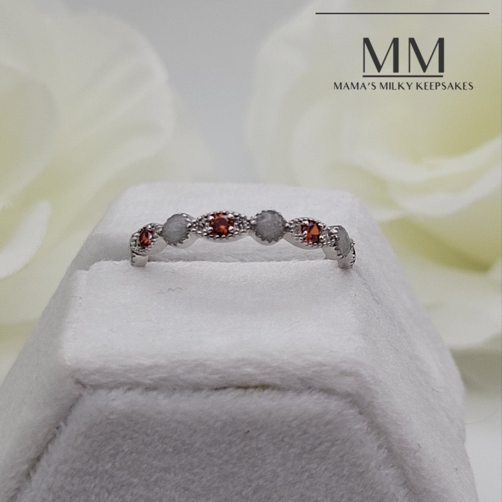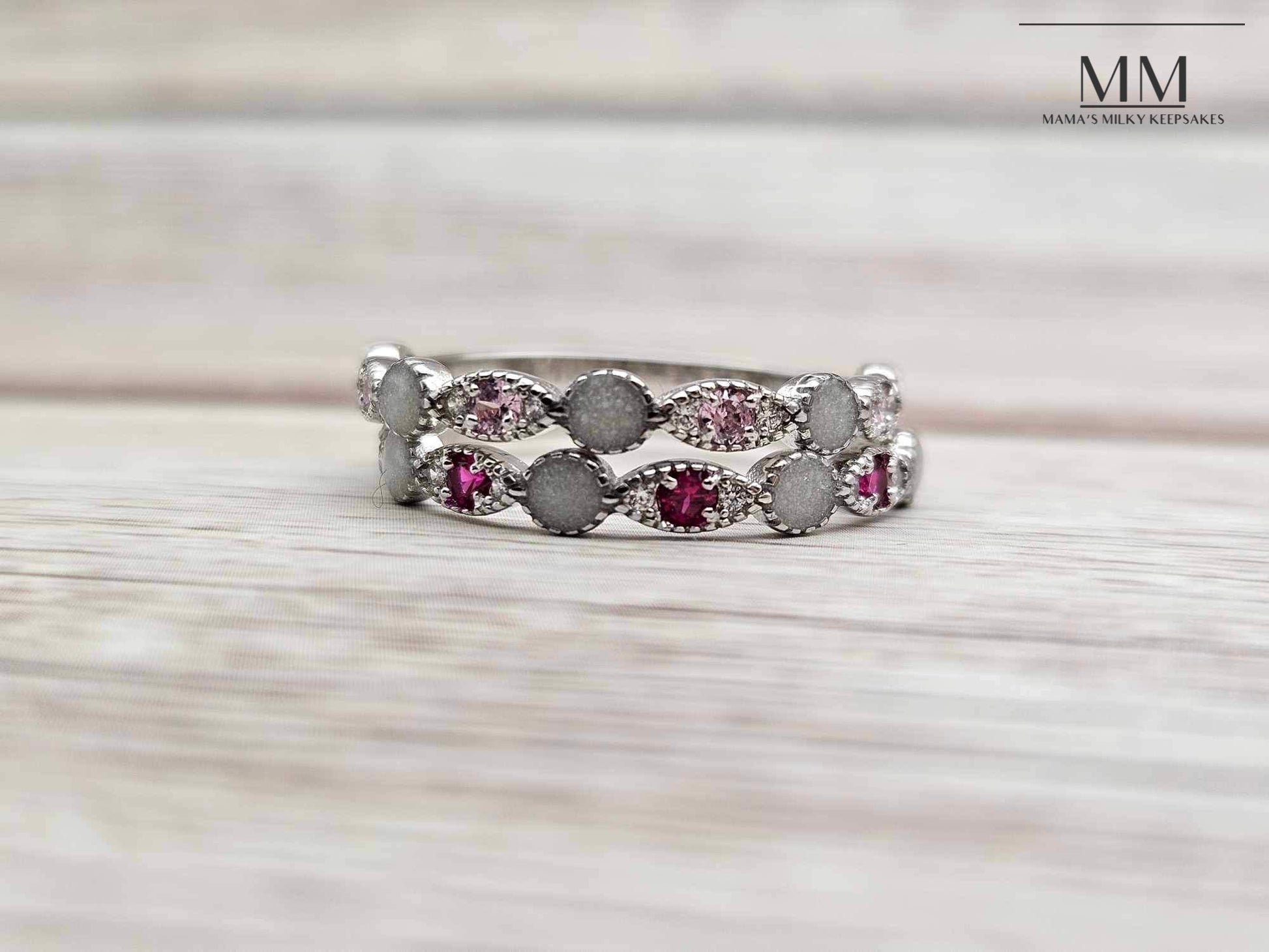 I can add whatever you want, into whatever piece you want. Ashes, formula, and soil work just the same as breastmilk so you are not limited to the piece(s) you can choose. For hair, fabric, flowers, etc I recommend choosing something with a bigger main stone and nothing like a stacking ring, so you can see your inclusions especially if you want it shaped any certain way or to see any particular pattern, lace, or texture. This is something we can talk about individually though for sure!