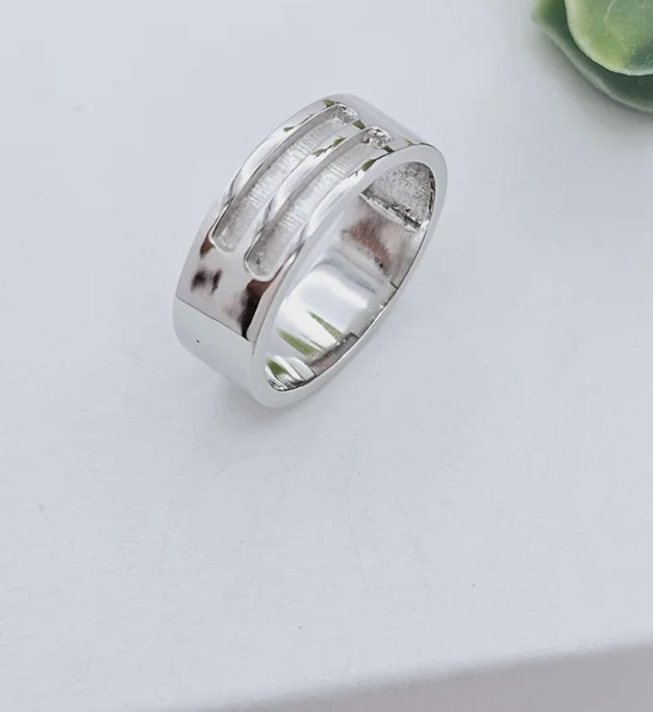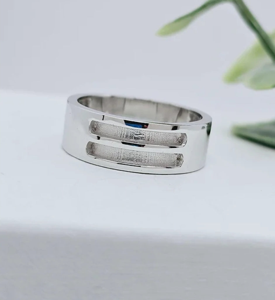 Featuring two channels in the middle of the 7mm wide band, this is the perfect ring to hold your inclusions. From breastmilk, baby hair, cremation ashes of loved ones or pets, to wedding flowers and more. This is a beautiful way to hold your memories closest to you.