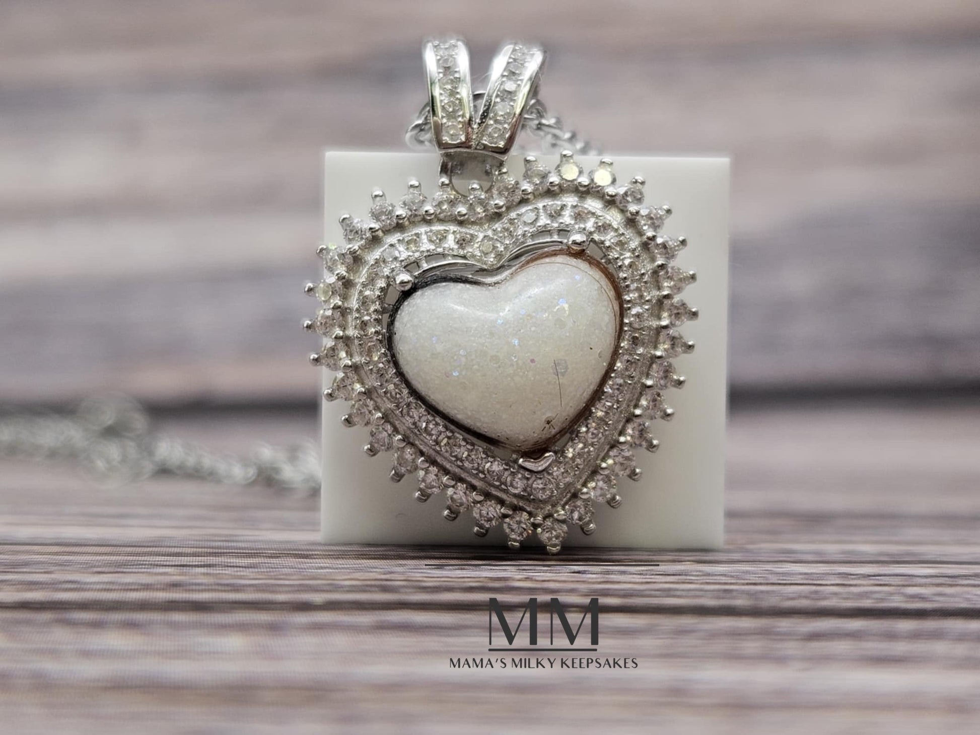 ♡Stone size: 8mm heart stone made with your inclusions, this piece can hold anything you want it to hold including breastmilk, ashes, formula, hair, pet hair, pet ashes, gravesite soil, dried flowers, umbilical cord, encapsulated placenta, fabric, etc.
