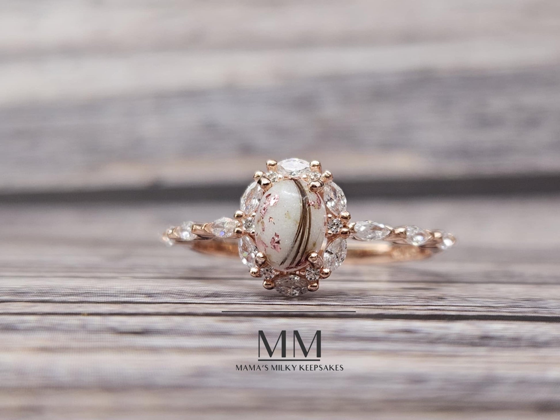 I can add whatever you want, into whatever piece you want. Ashes, formula, and soil work just the same as breastmilk so you are not limited to the piece(s) you can choose. For hair, fabric, flowers, etc I recommend choosing something with a bigger main stone and nothing like a stacking ring, so you can see your inclusions especially if you want it shaped any certain way or to see any particular pattern, lace, or texture. This is something we can talk about individually though for sure!
