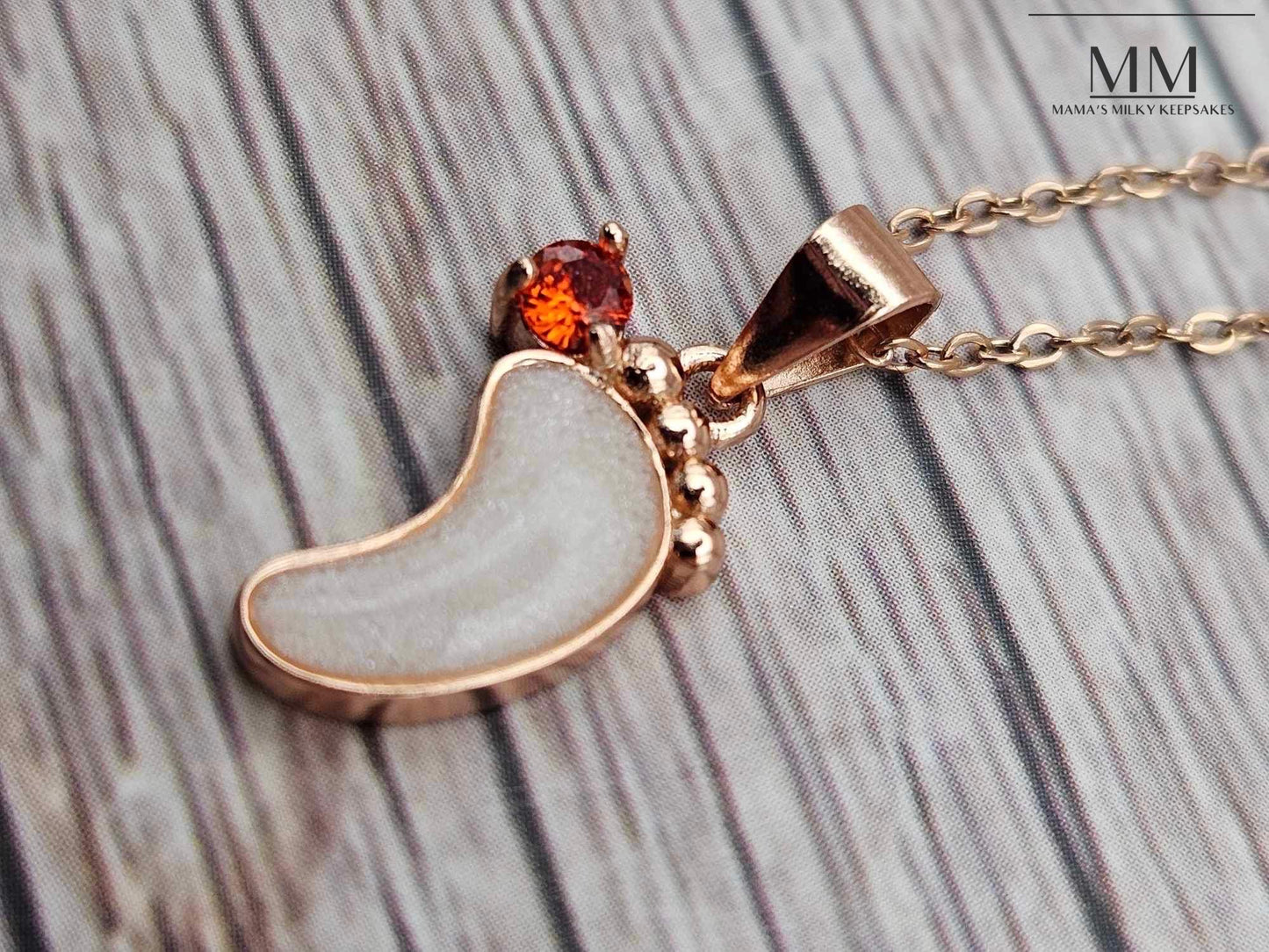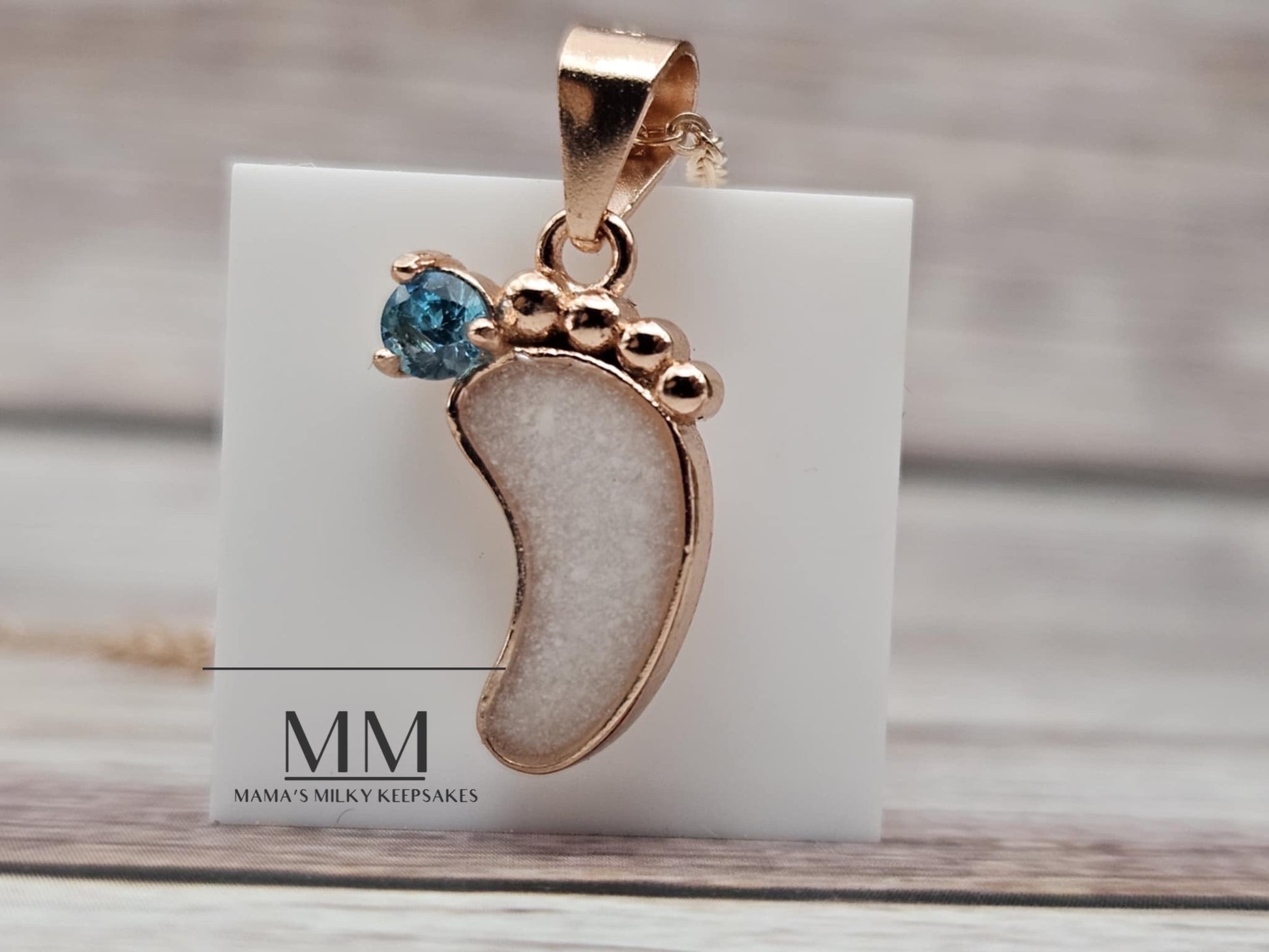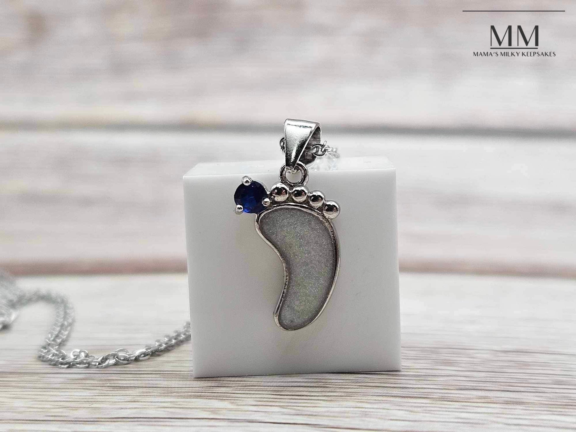 This beautiful pendant is in the shape of a tiny foot. The foot is empty to be filled with breastmilk or ashes, and the big toe can be any of the 12 birthstones or just white zircon. The pendant is approximately 11 x 15 mm.