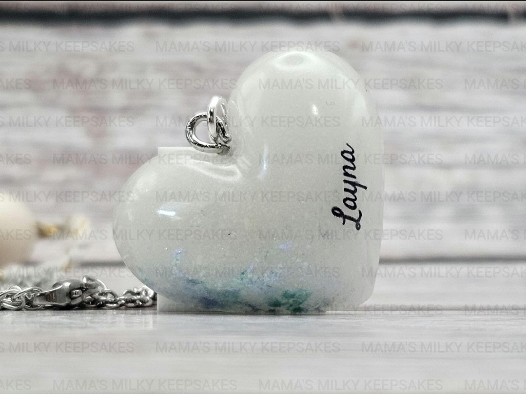 Please leave in the order notes the name you want on the heart and if you want flecks, what color you want the flecks to be, and if you want me to add a necklace attachment to the piece.