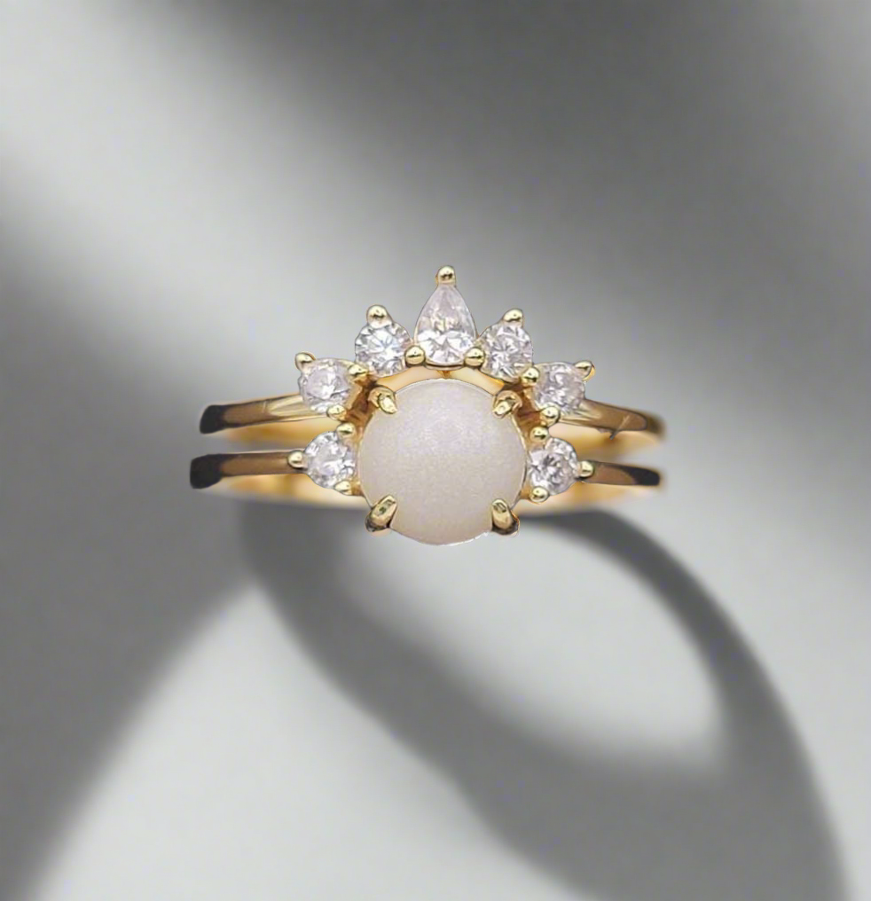 This beauty is made out of solid sterling silver and set with cubic zirconia diamonds. It comes with a thick plating of either white gold, rose gold, or yellow gold. It comes with two separate rings. The stacking ring holds no inclusions.