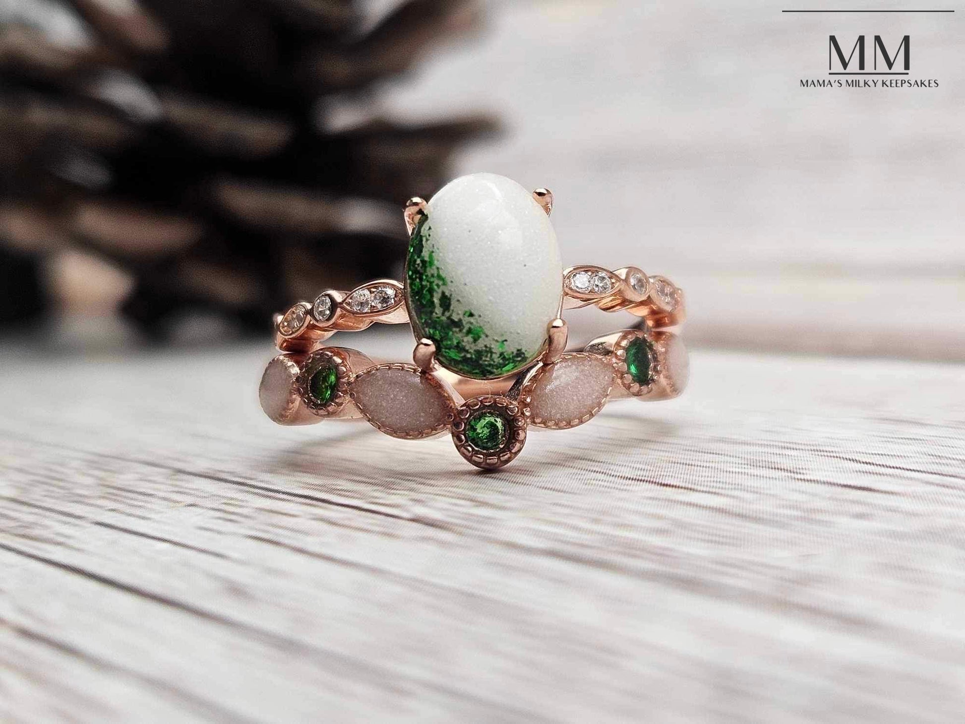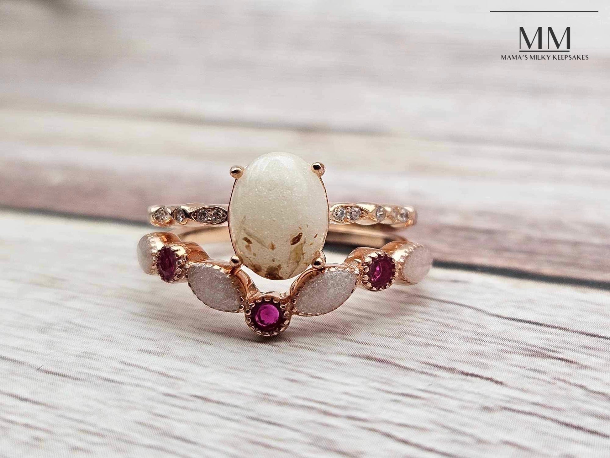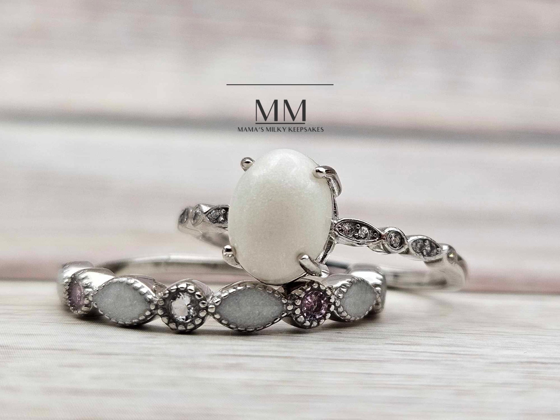 I can add whatever you want, into whatever piece you want. Ashes, formula, and soil work just the same as breastmilk so you are not limited to the piece(s) you can choose. For hair, fabric, flowers, etc I recommend choosing something with a bigger main stone and nothing like a stacking ring, so you can see your inclusions especially if you want it shaped any certain way or to see any particular pattern, lace, or texture. This is something we can talk about individually though for sure!