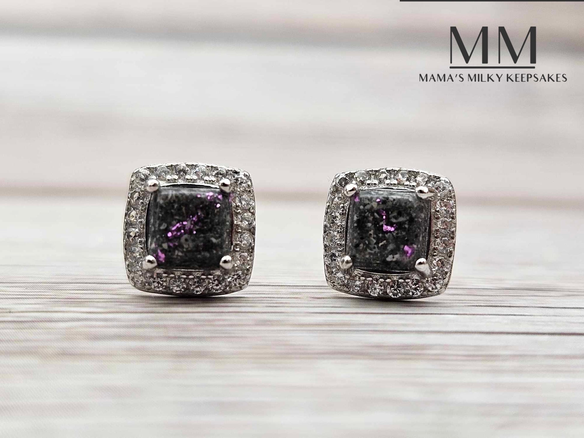These earrings holds a square stone made with your inclusions, this piece can hold anything you want it to hold including breastmilk, ashes, formula, hair, pet hair, pet ashes, (not limited to dogs, cat, horses, send me a message!), gravesite soil, dried flowers, umbilical cord, encapsulated placenta, fabric, ect.
