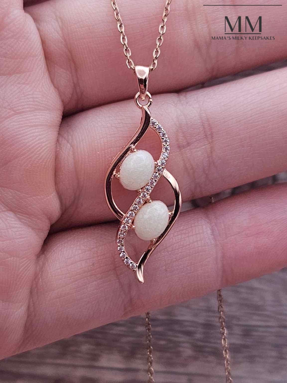 This necklace pendant holds two oval stone made with your inclusions, this piece can hold anything you want it to hold including breastmilk, ashes, formula, hair, pet hair, pet ashes, (not limited to dogs, cat, horses, send me a message!), gravesite soil, dried flowers, umbilical cord, encapsulated placenta, fabric, ect.