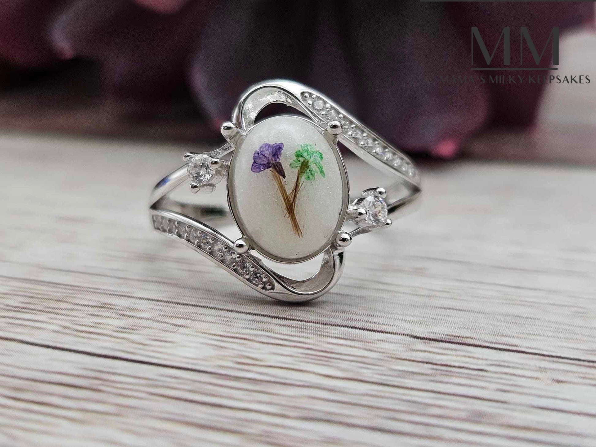 This ring holds a oval stone made with your inclusions, this piece can hold anything you want it to hold including breastmilk, ashes, formula, hair, pet hair, pet ashes, (not limited to dogs, cat, horses, send me a message!), gravesite soil, dried flowers, umbilical cord, encapsulated placenta, fabric, ect.