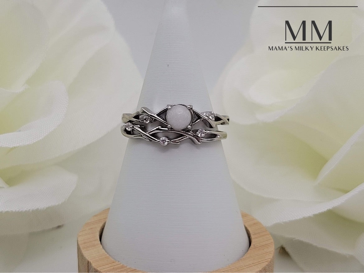 This ring holds a round stone made with your inclusions, this piece can hold anything you want it to hold including breastmilk, ashes, formula, hair, pet hair, pet ashes, (not limited to dogs, cat, horses, send me a message!), gravesite soil, dried flowers, umbilical cord, encapsulated placenta, fabric, ect.