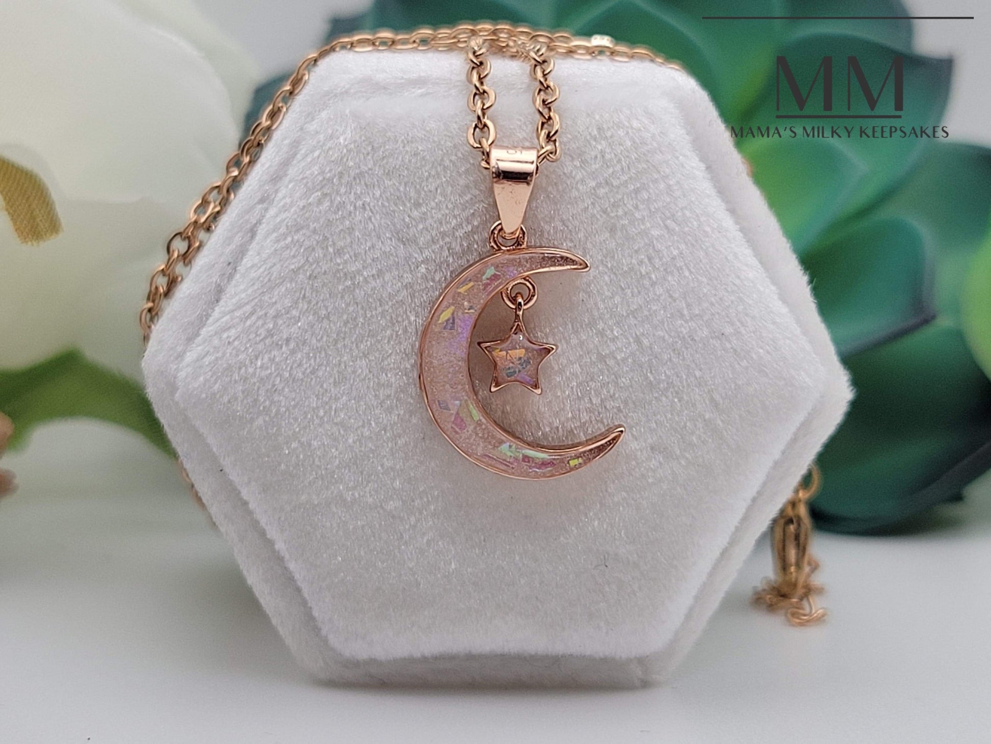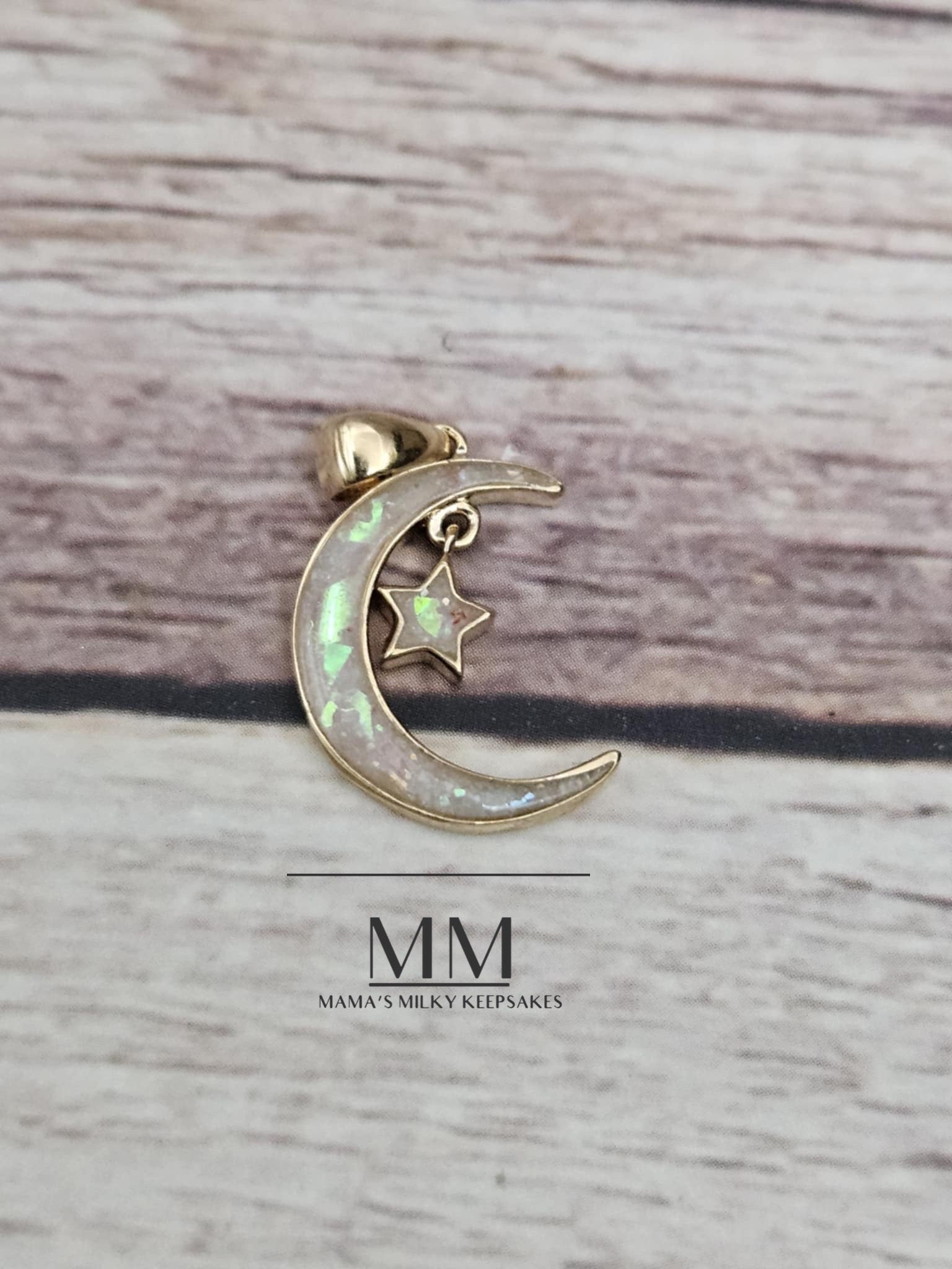 This pendant is made out of solid sterling silver. Both the moond and the star are empty and hold your milk/ash stone.