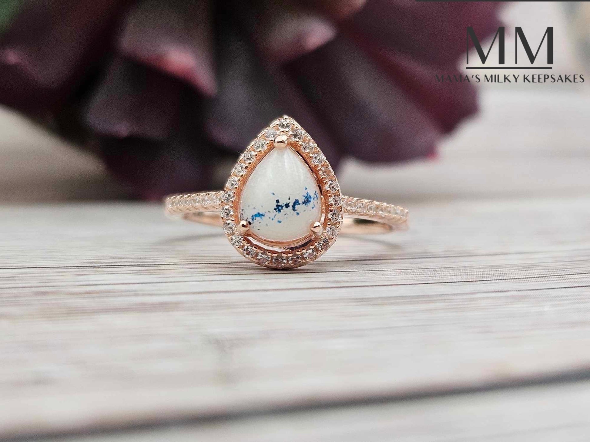 This ring holds a pear stone made with your inclusions, this piece can hold anything you want it to hold including breastmilk, ashes, formula, hair, pet hair, pet ashes, (not limited to dogs, cat, horses, send me a message!), gravesite soil, dried flowers, umbilical cord, encapsulated placenta, fabric, ect.
