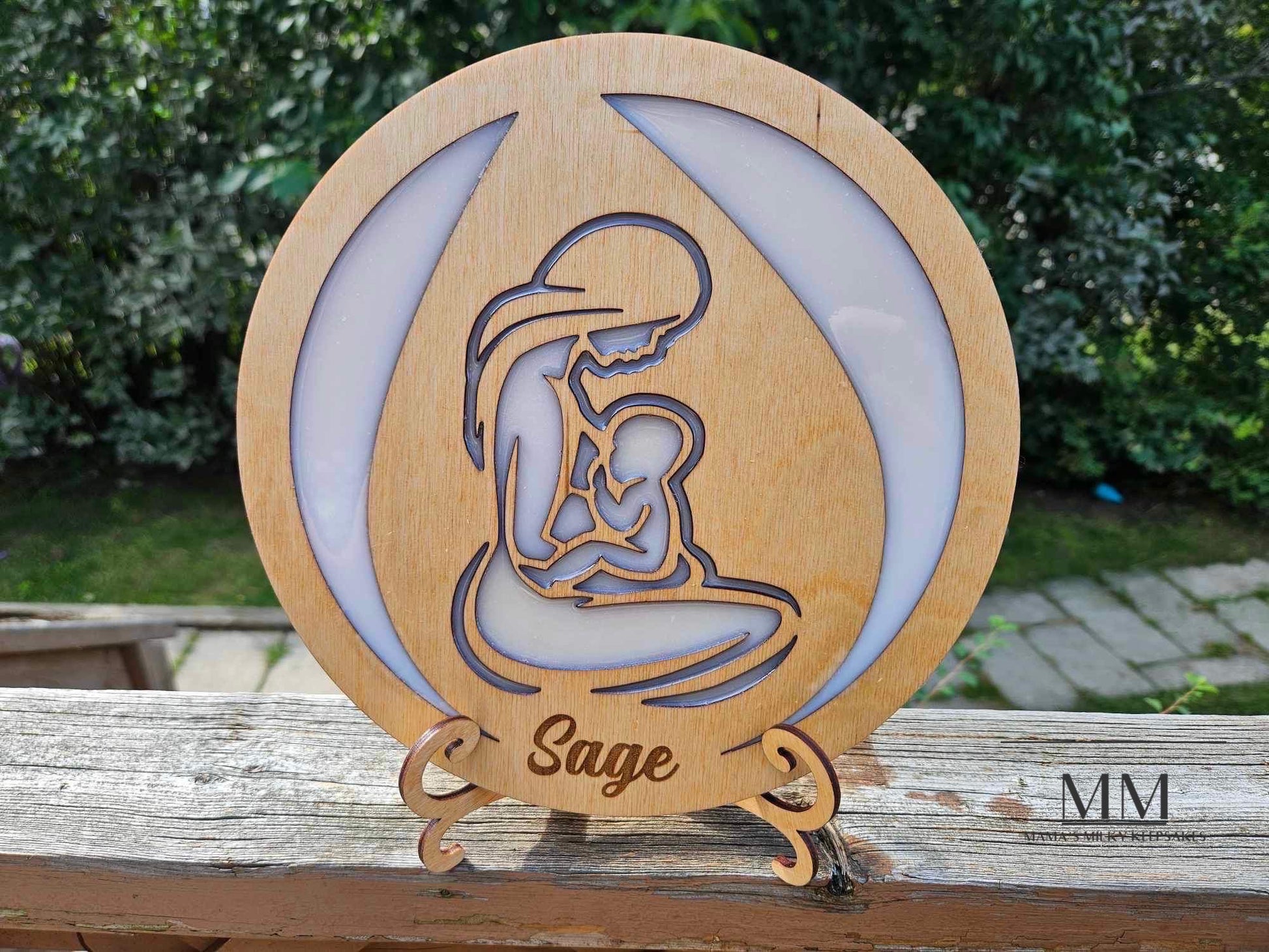 This is a 10 inch plaque made with maple, filled with breastmilk epoxy resin, and then the wood is stained.