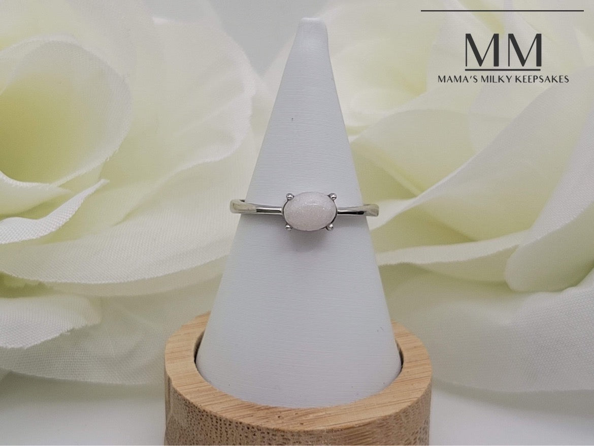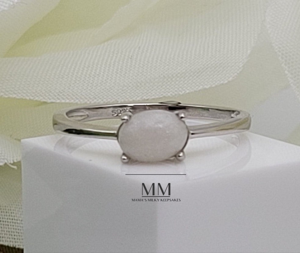 This ring holds a oval stone made with your inclusions, this piece can hold anything you want it to hold including breastmilk, ashes, formula, hair, pet hair, pet ashes, (not limited to dogs, cat, horses, send me a message!), gravesite soil, dried flowers, umbilical cord, encapsulated placenta, fabric, ect.