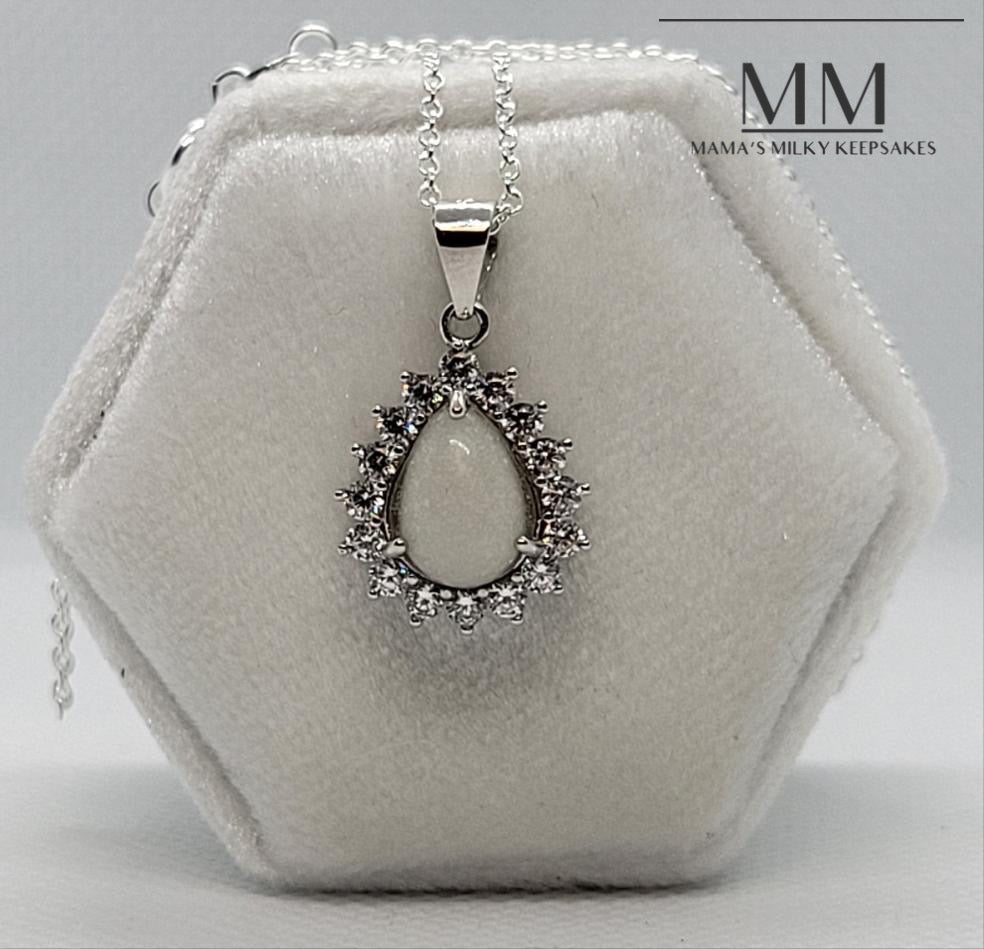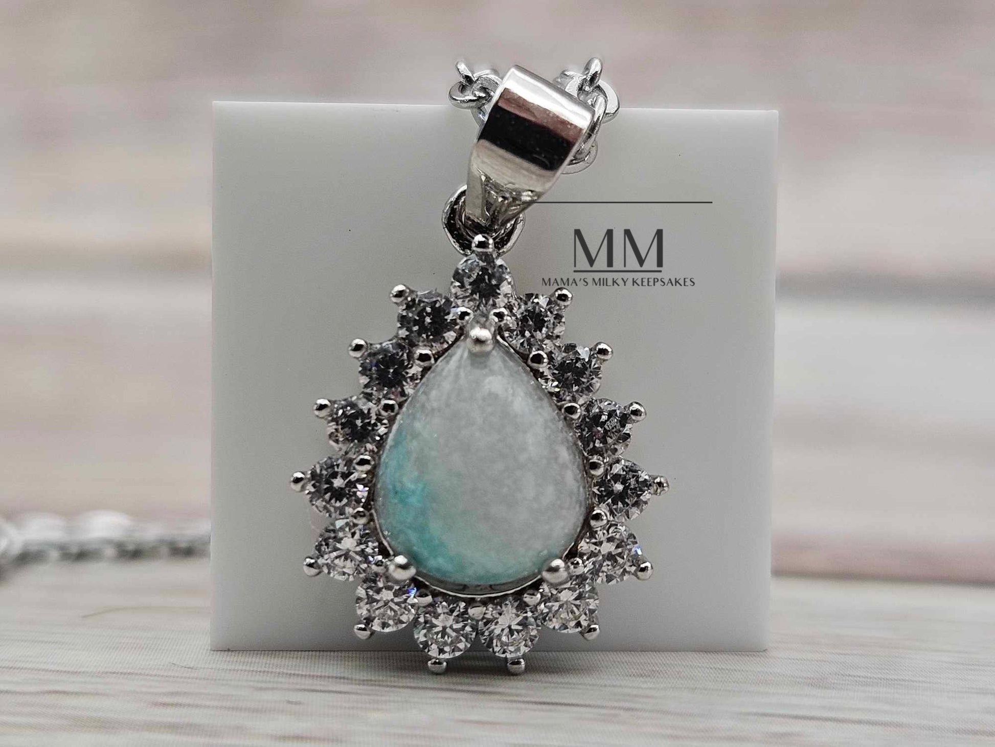 This necklace pendant holds a 8x10mm pear stone made with your inclusions, this piece can hold anything you want it to hold including breastmilk, ashes, formula, hair, pet hair, pet ashes, (not limited to dogs, cat, horses, send me a message!), gravesite soil, dried flowers, umbilical cord, encapsulated placenta, fabric, ect.