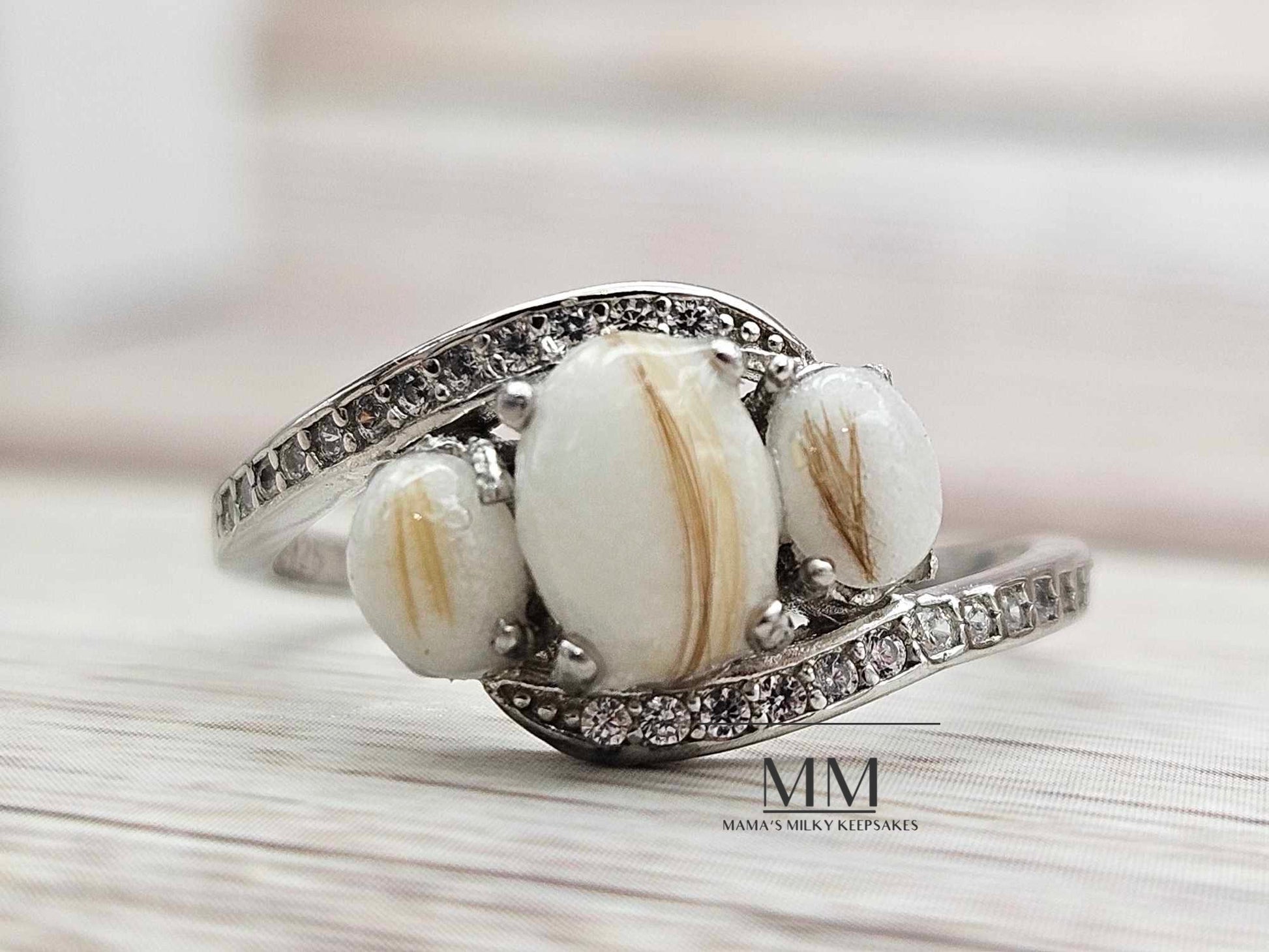 This ring has three oval stones made with your inclusions, this piece can hold anything you want it to hold including breastmilk, ashes, formula, hair, pet hair, pet ashes, (not limited to dogs, cat, horses, send me a message!), gravesite soil, dried flowers, umbilical cord, encapsulated placenta, fabric, ect.