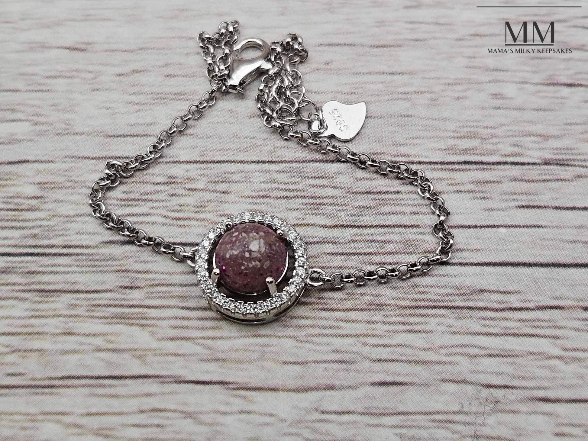 This bracelet holds a 7mm round stone made with your inclusions, this piece can hold anything you want it to hold including breastmilk, ashes, formula, hair, pet hair, pet ashes, (not limited to dogs, cat, horses, send me a message!), gravesite soil, dried flowers, umbilical cord, encapsulated placenta, fabric, ect.
