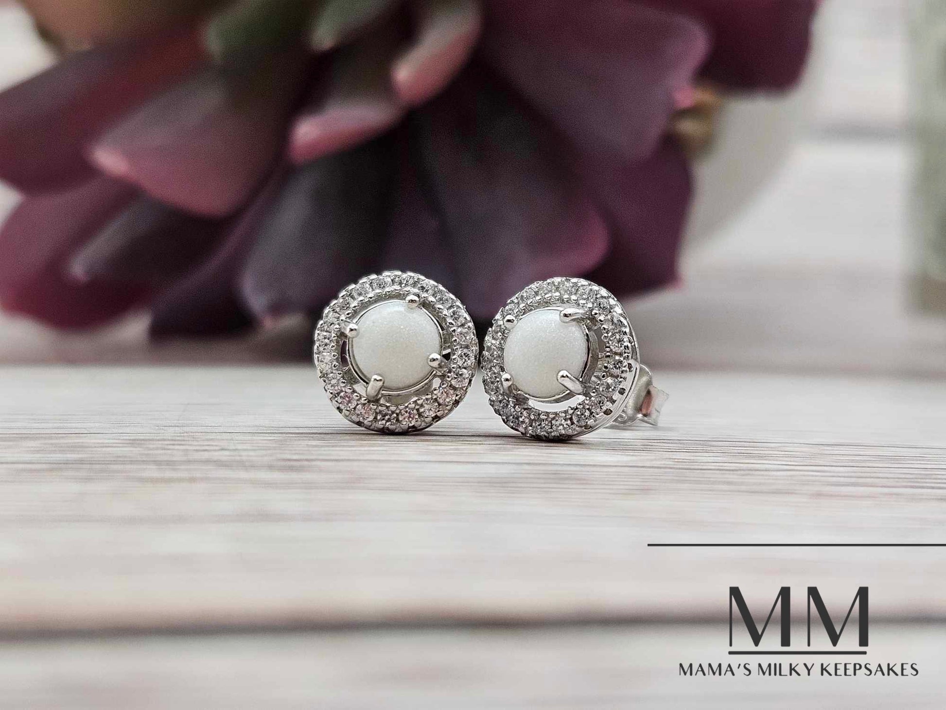 These earrings holds a 4mm round stone made with your inclusions, this piece can hold anything you want it to hold including breastmilk, ashes, formula, hair, pet hair, pet ashes, (not limited to dogs, cat, horses, send me a message!), gravesite soil, dried flowers, umbilical cord, encapsulated placenta, fabric, ect.