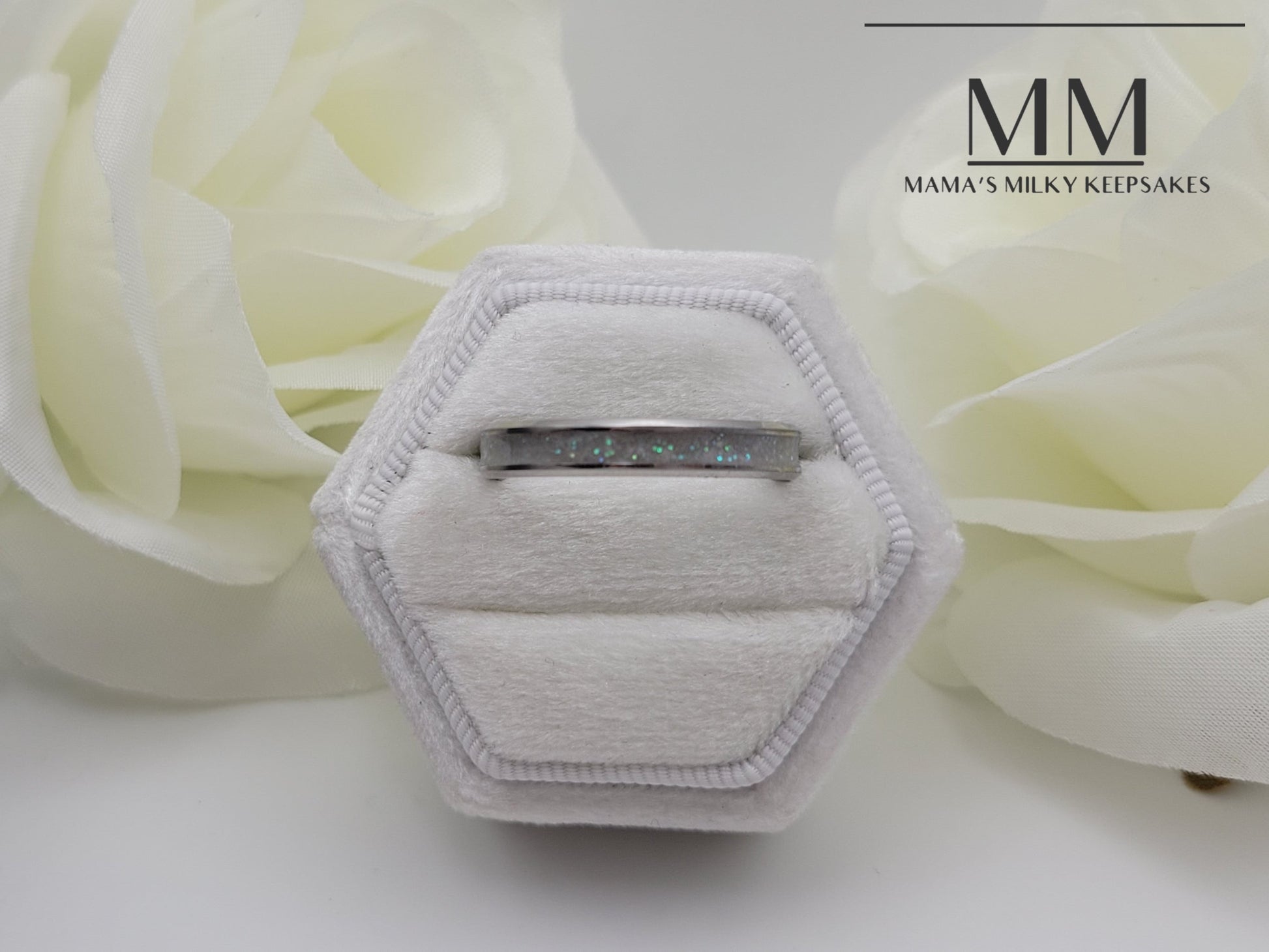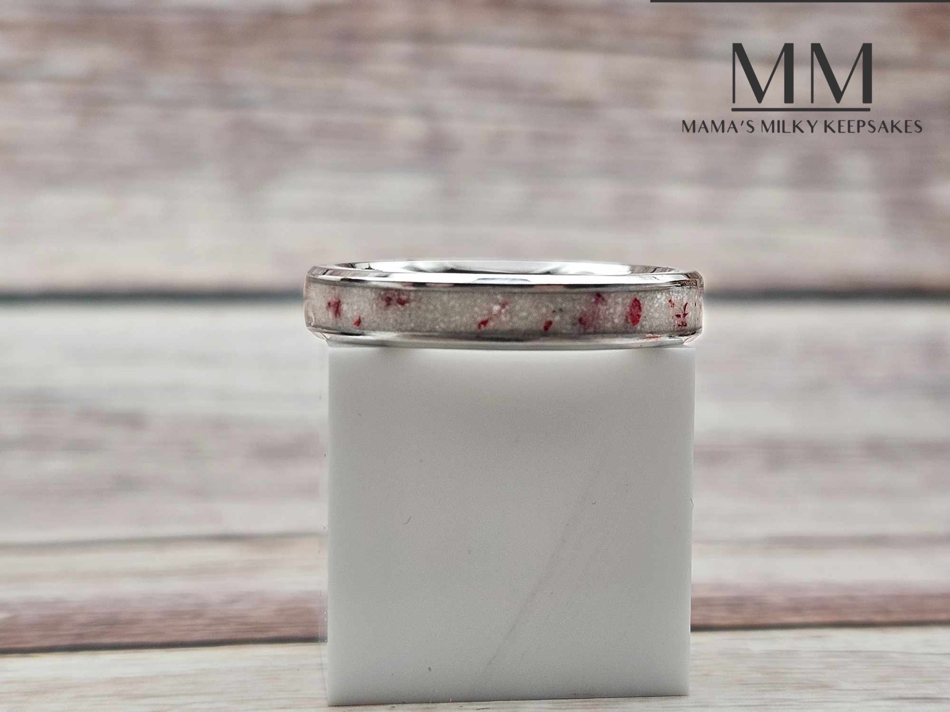 This thin band holds a 2mm channel with your inclusions, this piece can hold anything you want it to hold including breastmilk, ashes, formula, hair, pet hair, pet ashes, (not limited to dogs, cat, horses, send me a message!), gravesite soil, dried flowers, umbilical cord, encapsulated placenta, fabric, ect.