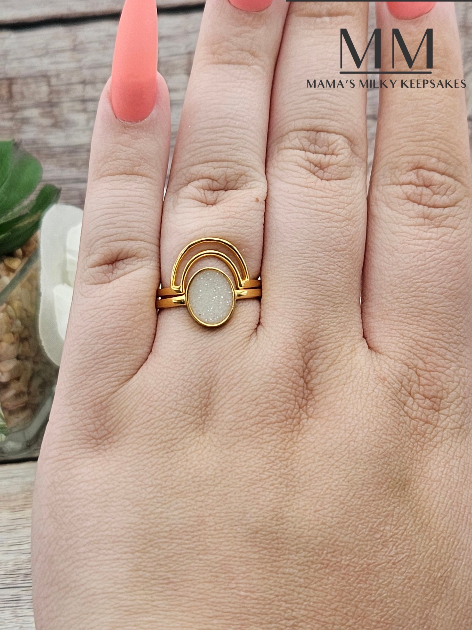 ♡ This ring is two separate rings. The top ring with two arches holds no inclusions. The oval ring holds an 8 x 10 mm oval stone made with your inclusions, this piece can hold anything you want it to hold including breastmilk, ashes, formula, hair, pet hair, pet ashes, (not limited to dogs, cat, horses, send me a message!), gravesite soil, dried flowers, umbilical cord, encapsulated placenta, fabric, etc.