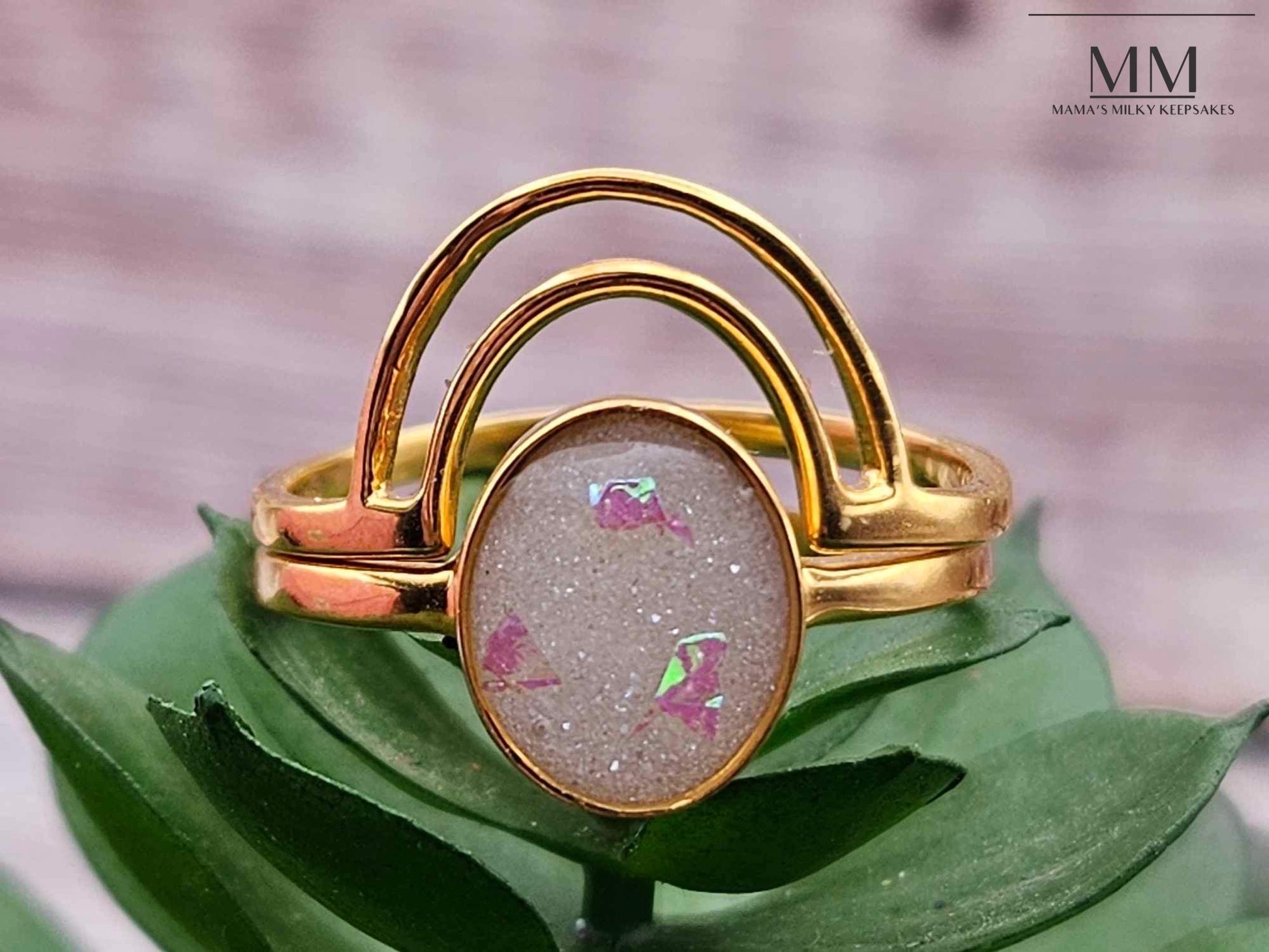 ♡ This ring is two separate rings. The top ring with two arches holds no inclusions. The oval ring holds an 8 x 10 mm oval stone made with your inclusions, this piece can hold anything you want it to hold including breastmilk, ashes, formula, hair, pet hair, pet ashes, (not limited to dogs, cat, horses, send me a message!), gravesite soil, dried flowers, umbilical cord, encapsulated placenta, fabric, etc