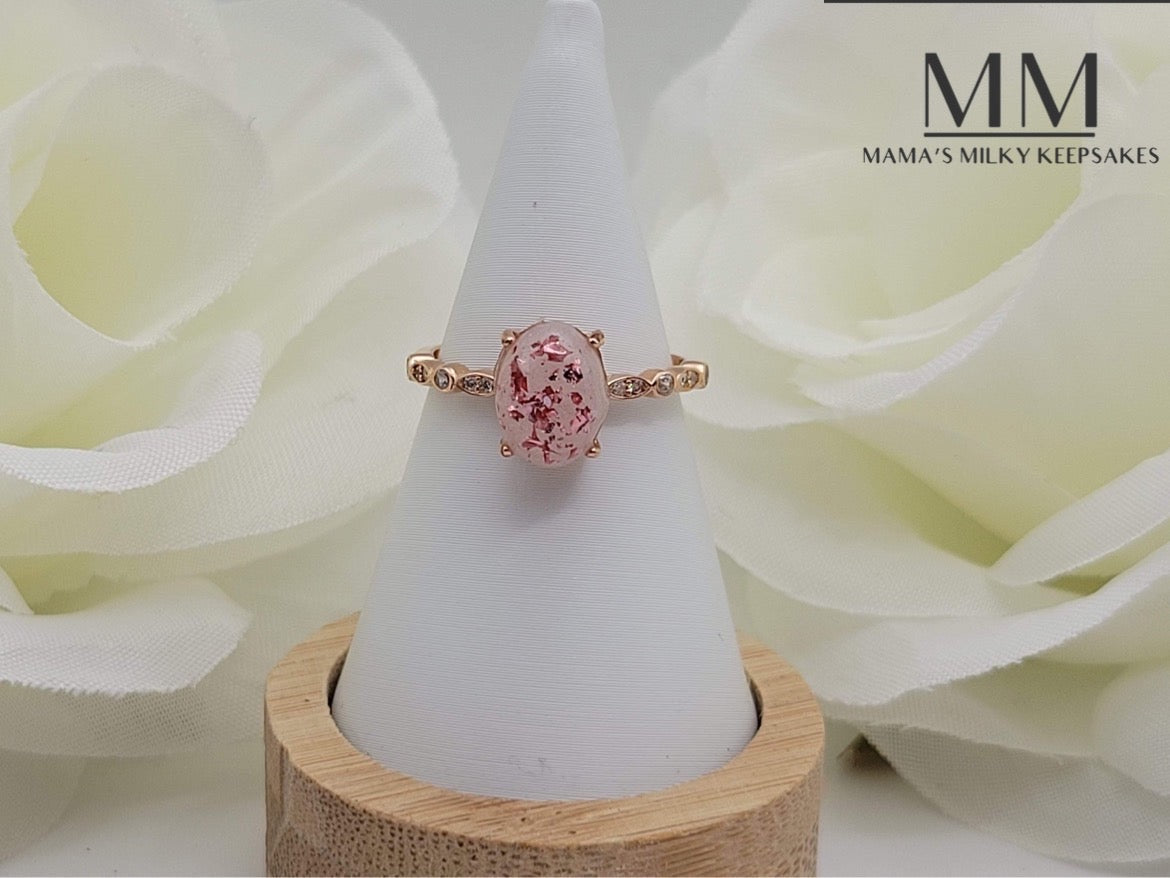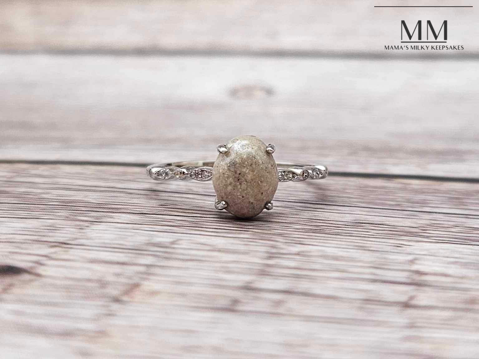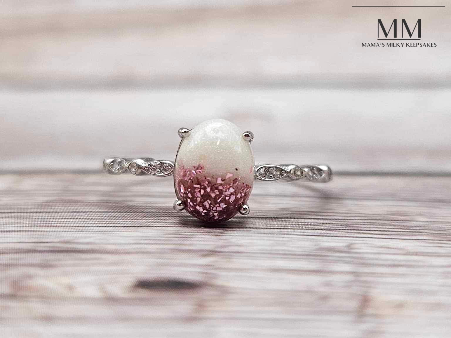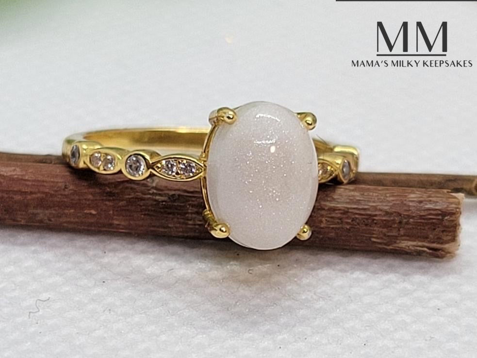 This ring holds a 7x9mm oval stone made with your inclusions, this piece can hold anything you want it to hold including breastmilk, ashes, formula, hair, pet hair, pet ashes, (not limited to dogs, cat, horses, send me a message!), gravesite soil, dried flowers, umbilical cord, encapsulated placenta, fabric, ect.