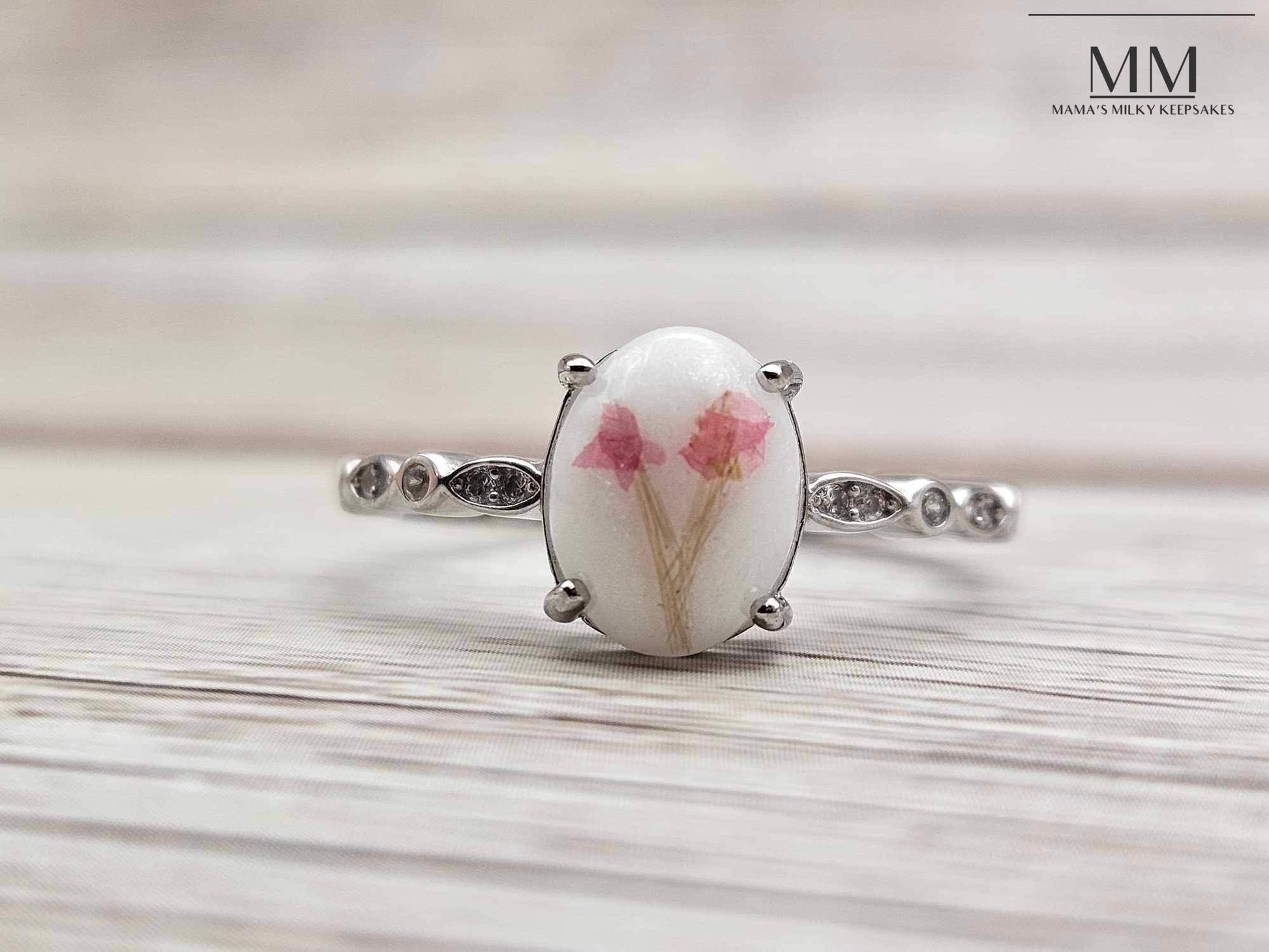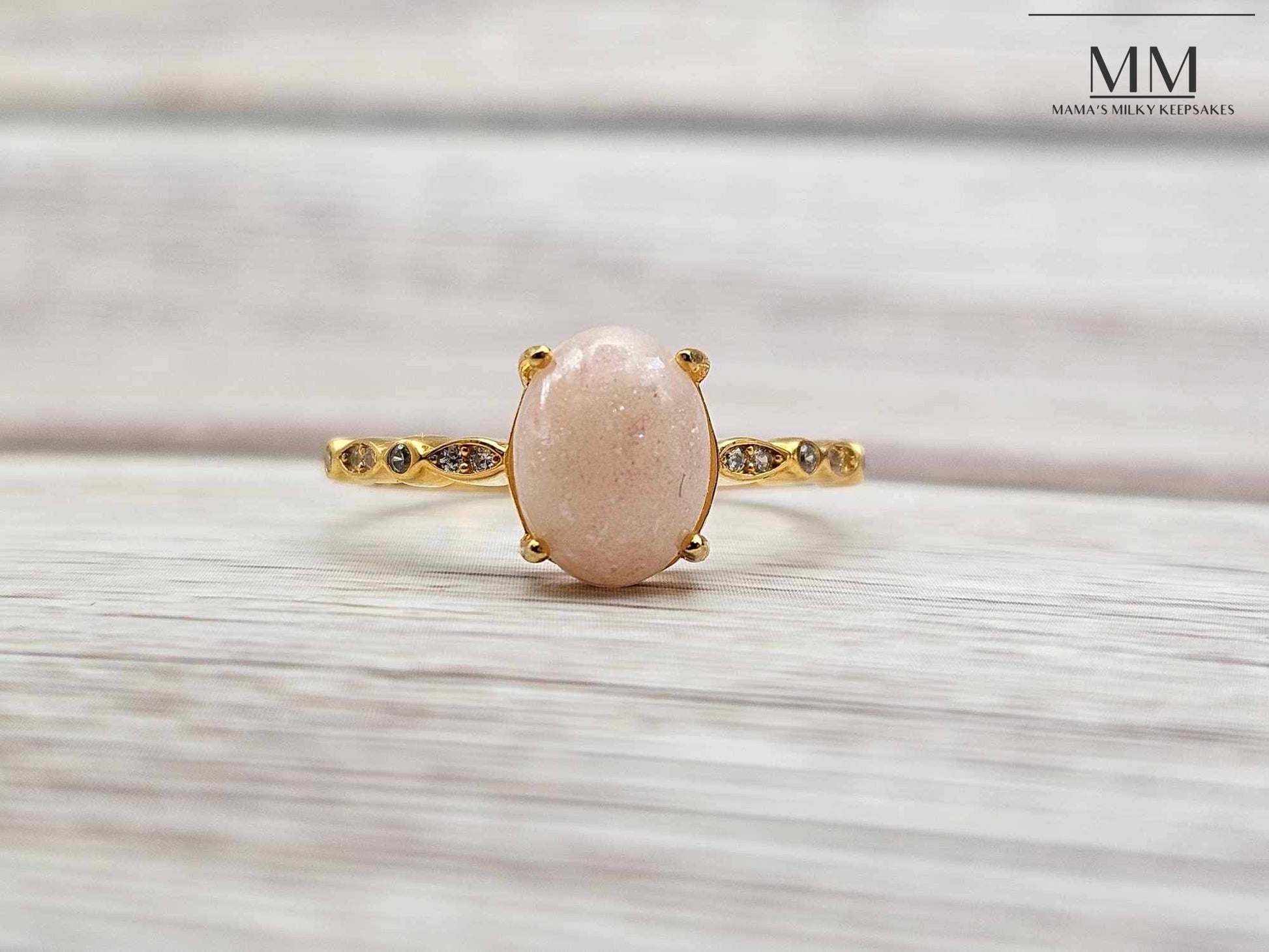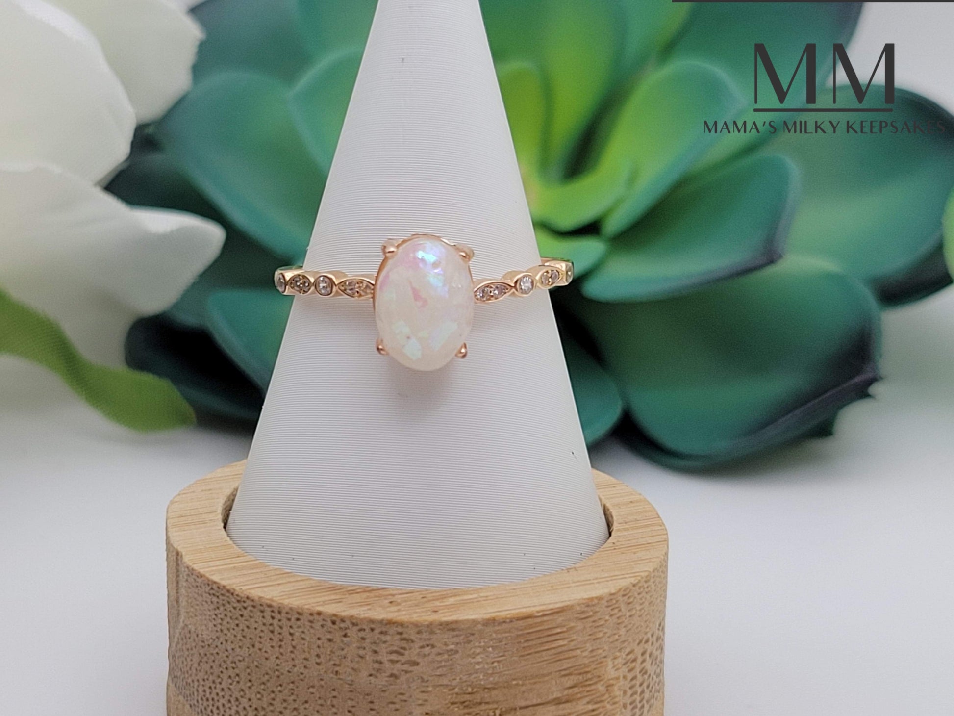This ring holds a 7x9mm oval stone made with your inclusions, this piece can hold anything you want it to hold including breastmilk, ashes, formula, hair, pet hair, pet ashes, (not limited to dogs, cat, horses, send me a message!), gravesite soil, dried flowers, umbilical cord, encapsulated placenta, fabric, ect.