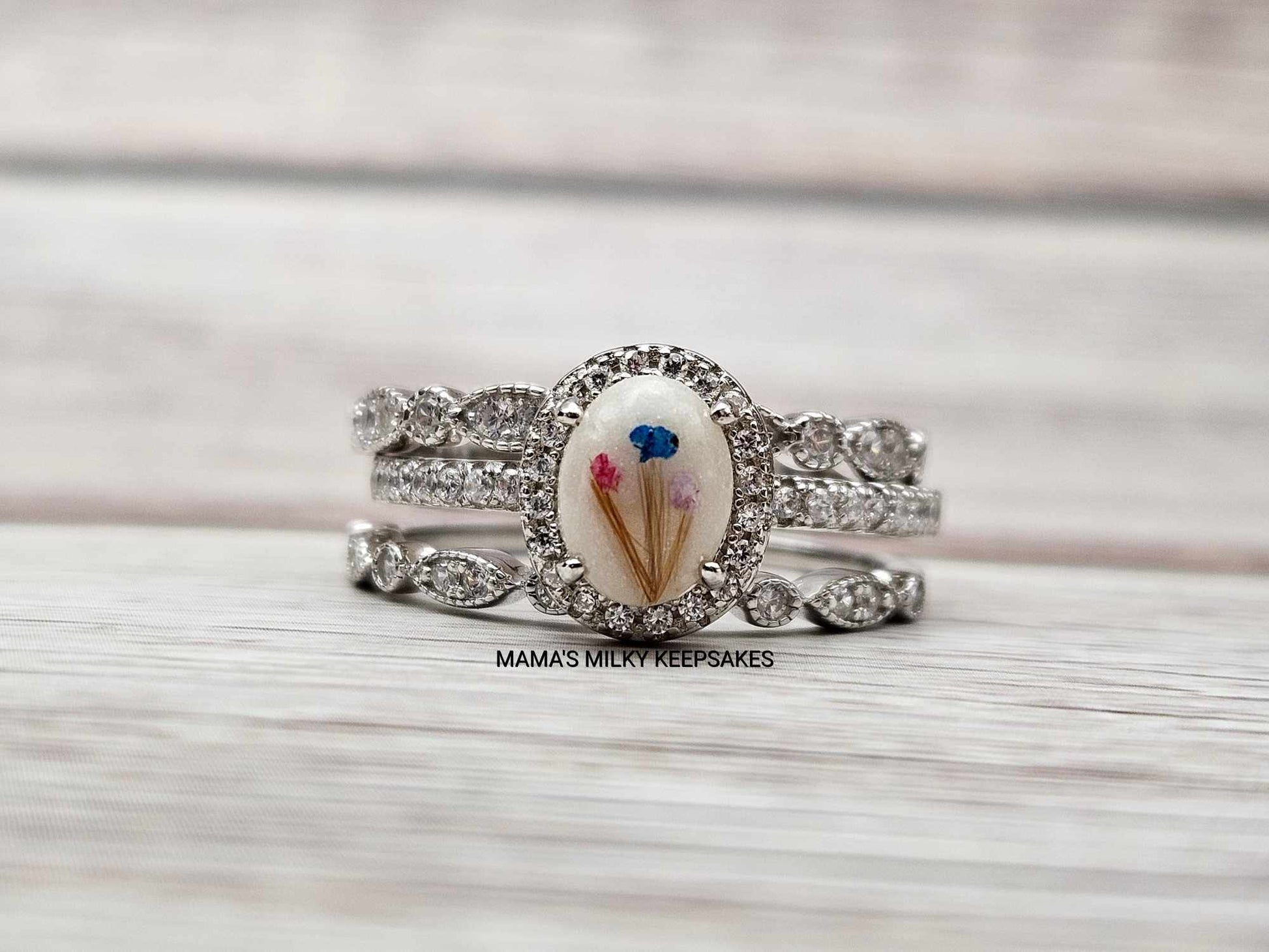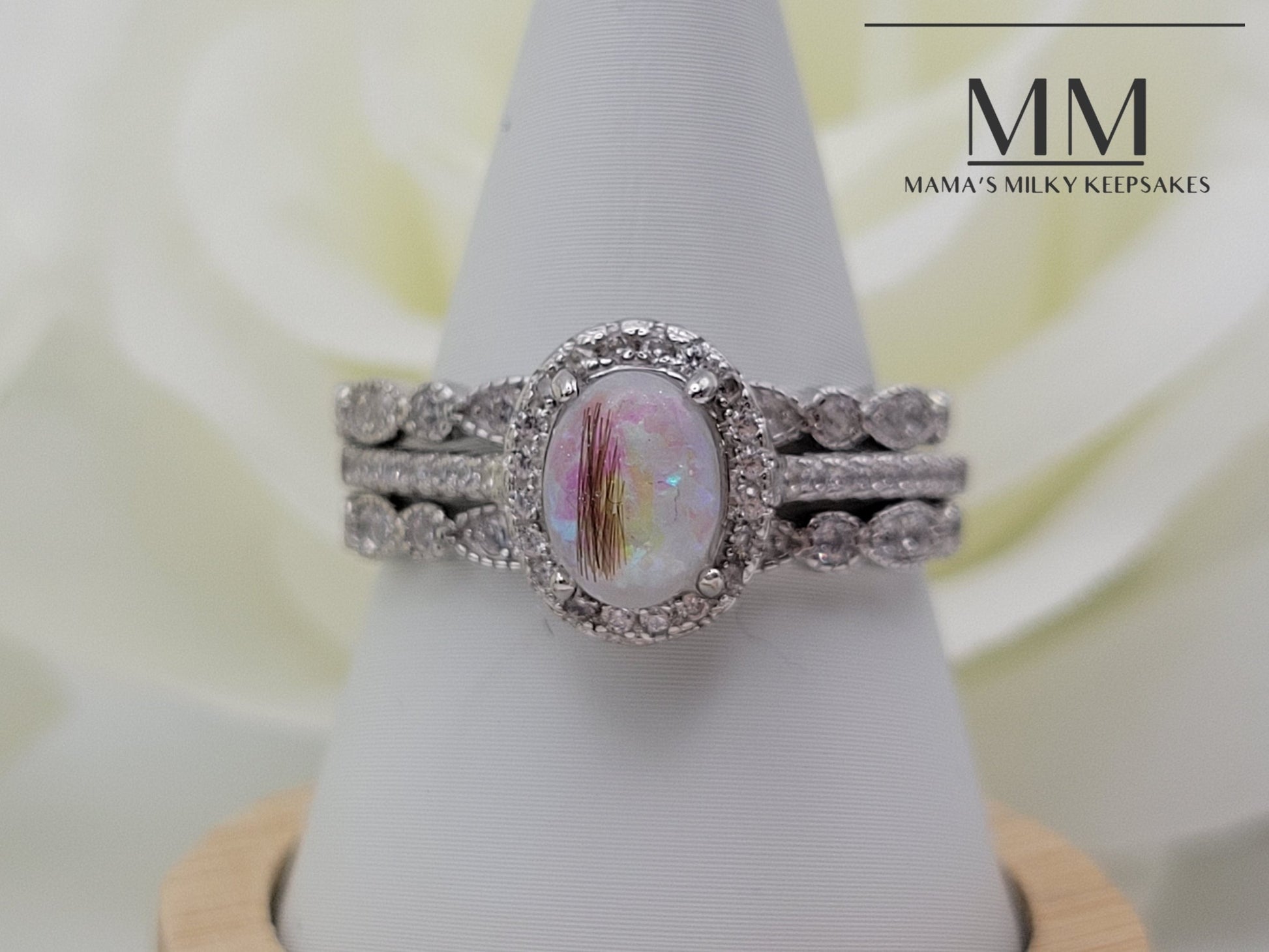 This ring holds a oval stone made with your inclusions, this piece can hold anything you want it to hold including breastmilk, ashes, formula, hair, pet hair, pet ashes, (not limited to dogs, cat, horses, send me a message!), gravesite soil, dried flowers, umbilical cord, encapsulated placenta, fabric, ect.
