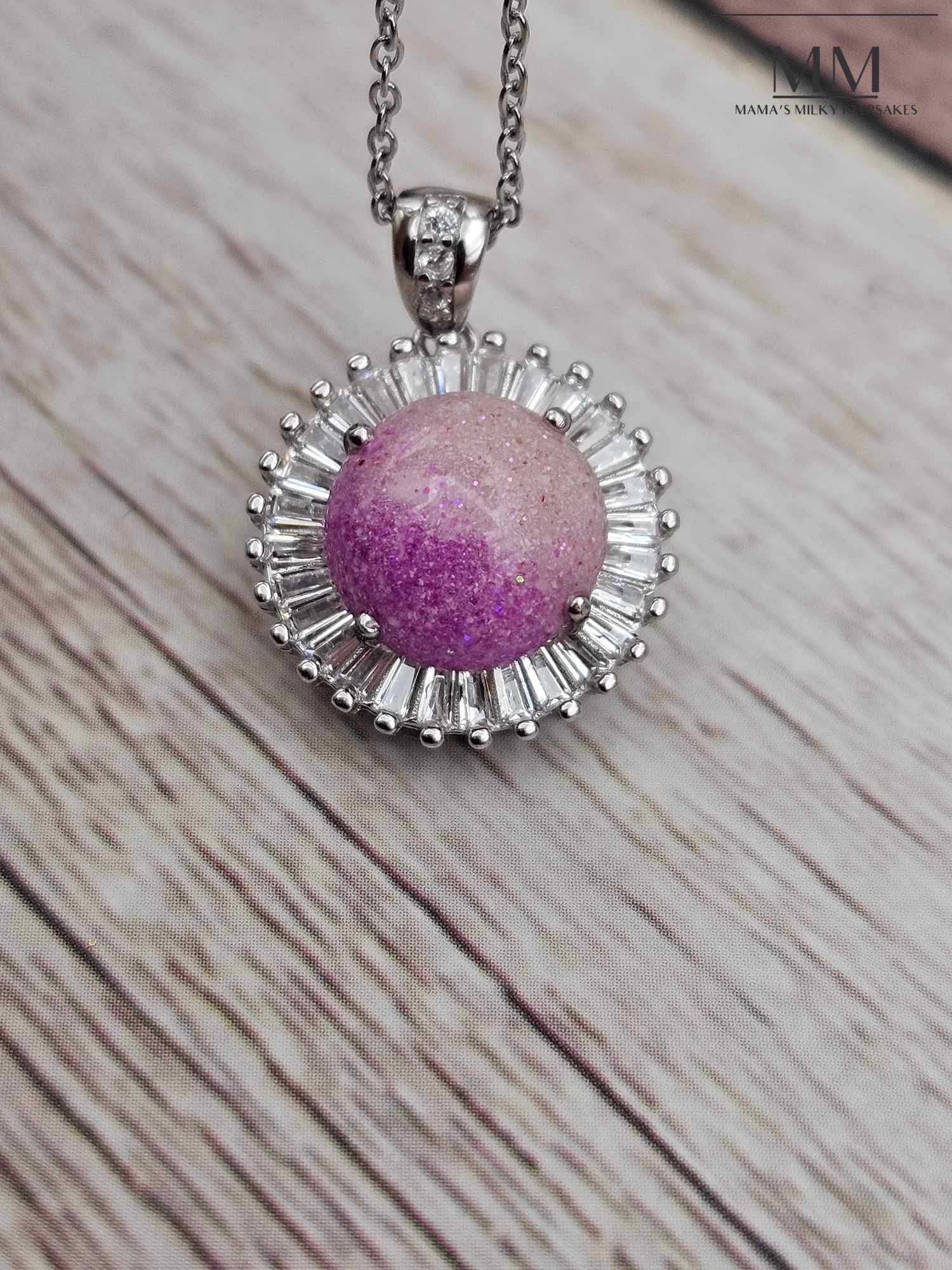 This necklace pendant holds a 8mm round stone made with your inclusions, this piece can hold anything you want it to hold including breastmilk, ashes, formula, hair, pet hair, pet ashes, (not limited to dogs, cat, horses, send me a message!), gravesite soil, dried flowers, umbilical cord, encapsulated placenta, fabric, ect.