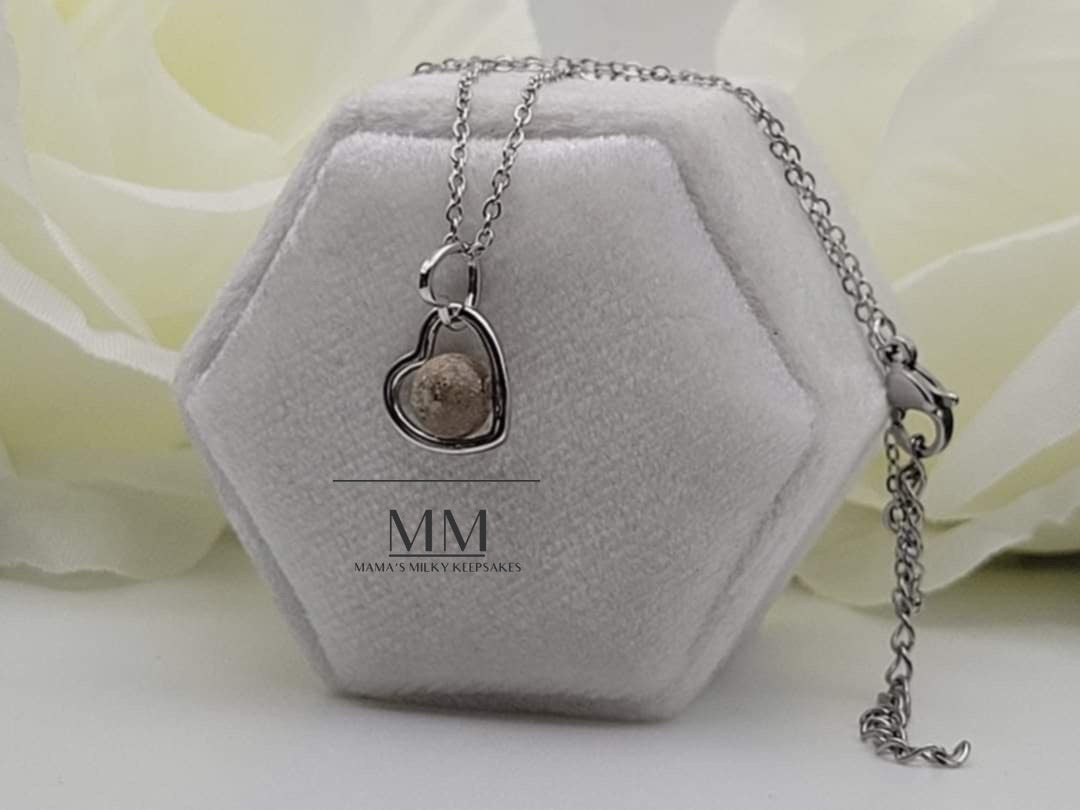 This necklace pendant holds a 8mm round stone made with your inclusions, this piece can hold anything you want it to hold including breastmilk, ashes, formula, hair, pet hair, pet ashes, (not limited to dogs, cat, horses, send me a message!), gravesite soil, dried flowers, umbilical cord, encapsulated placenta, fabric, ect.
