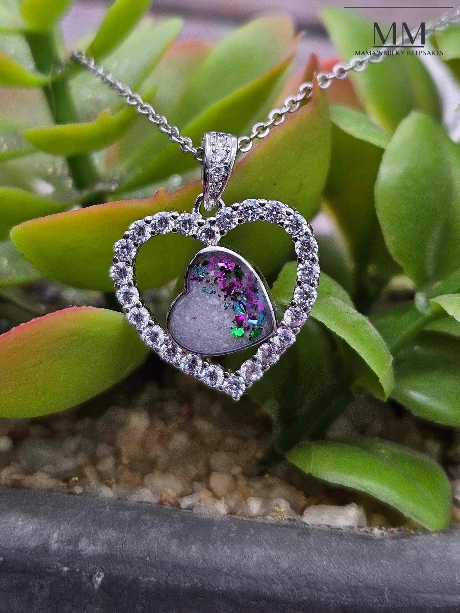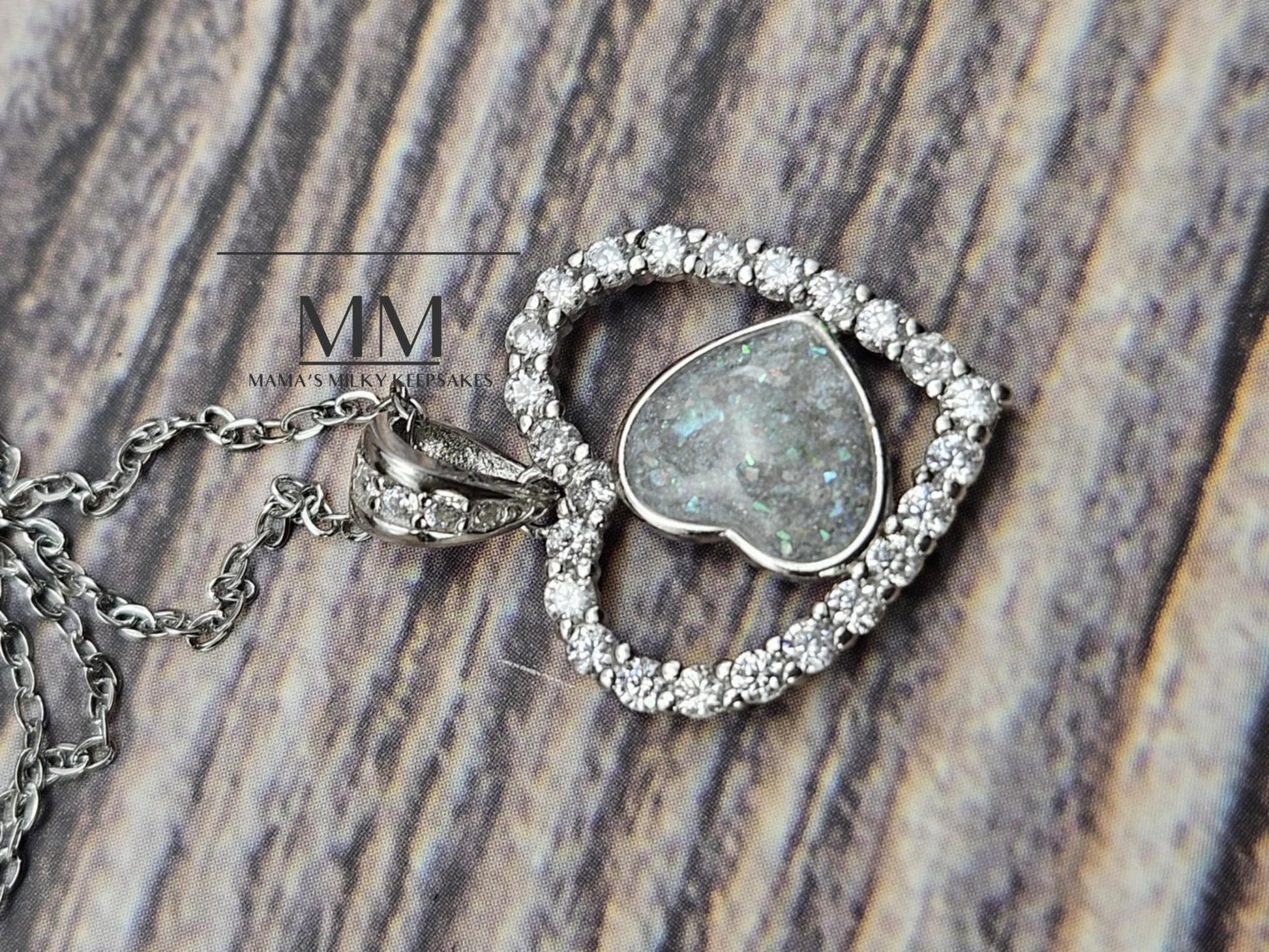 It features an open heart pendant, with a complete halo of white cubic zirconia diamonds. Inside the heart, is a smaller, off-center heart, approximately 8 mm in diameter, that will hold your ash or milk stone!
