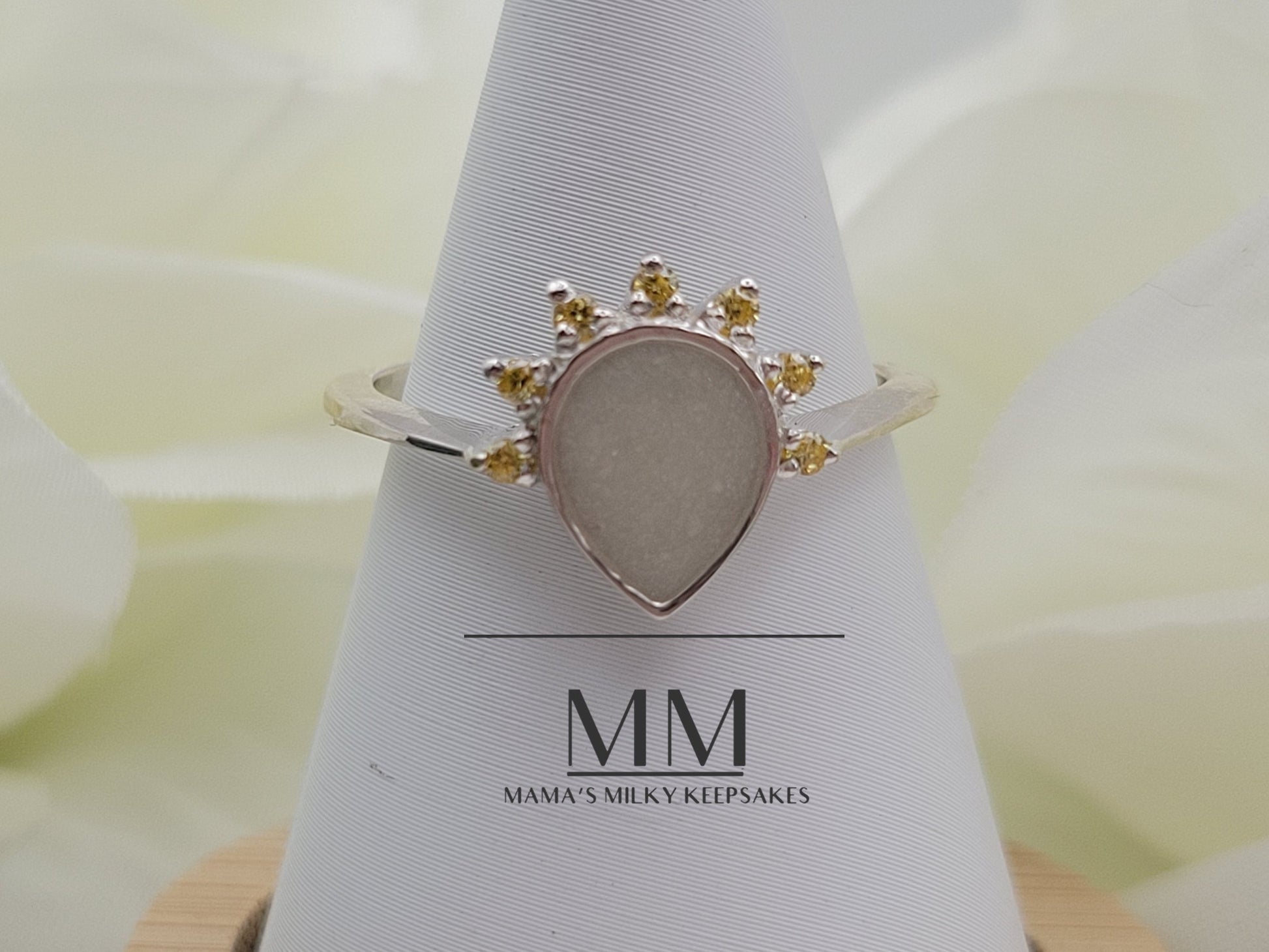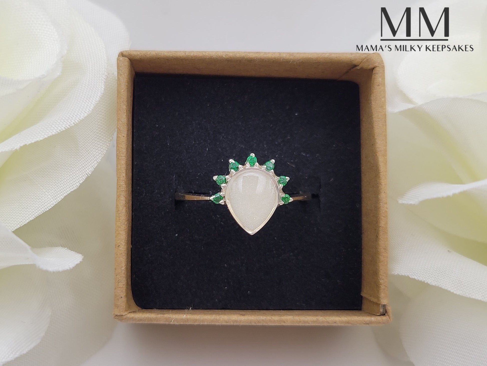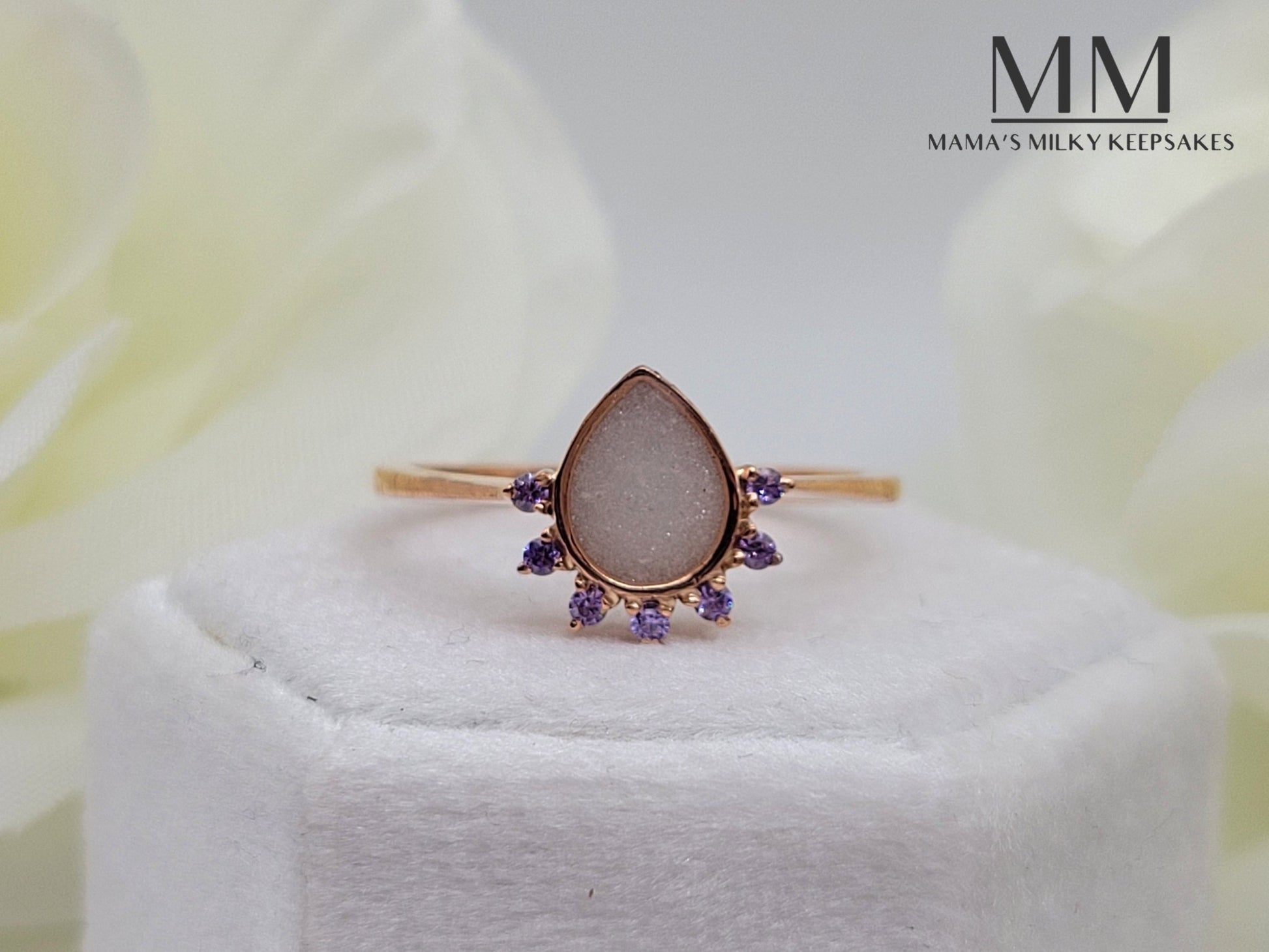 I can add whatever you want, into whatever piece you want. Ashes, formula, and soil work just the same as breastmilk so you are not limited to the piece(s) you can choose. For hair, fabric, flowers, etc I recommend choosing something with a bigger main stone and nothing like a stacking ring, so you can see your inclusions especially if you want it shaped any certain way or to see any particular pattern, lace, or texture. This is something we can talk about individually though for sure!