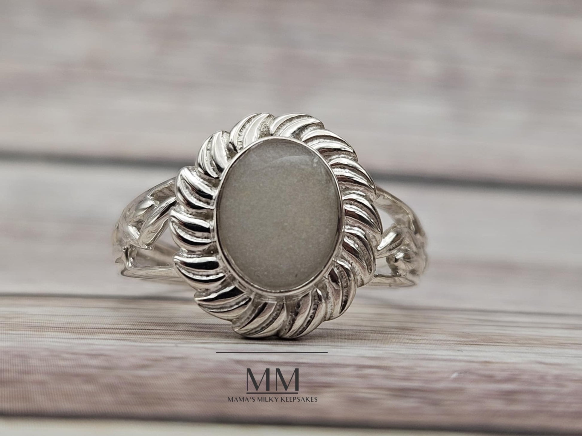 I can add whatever you want, into whatever piece you want. Ashes, formula, and soil work just the same as breastmilk so you are not limited to the piece(s) you can choose. For hair, fabric, flowers, etc I recommend choosing something with a bigger main stone and nothing like a stacking ring, so you can see your inclusions especially if you want it shaped any certain way or to see any particular pattern, lace, or texture. This is something we can talk about individually though for sure!