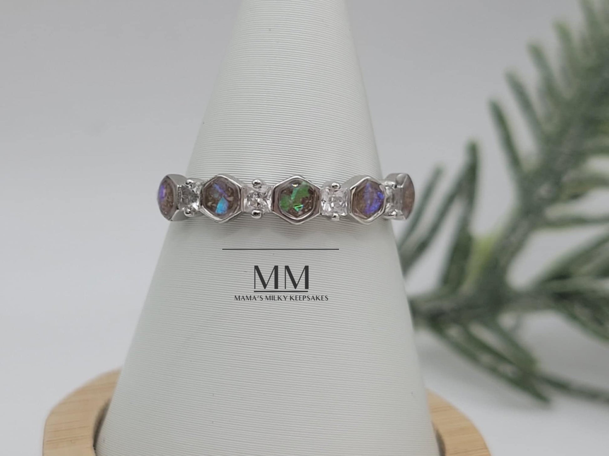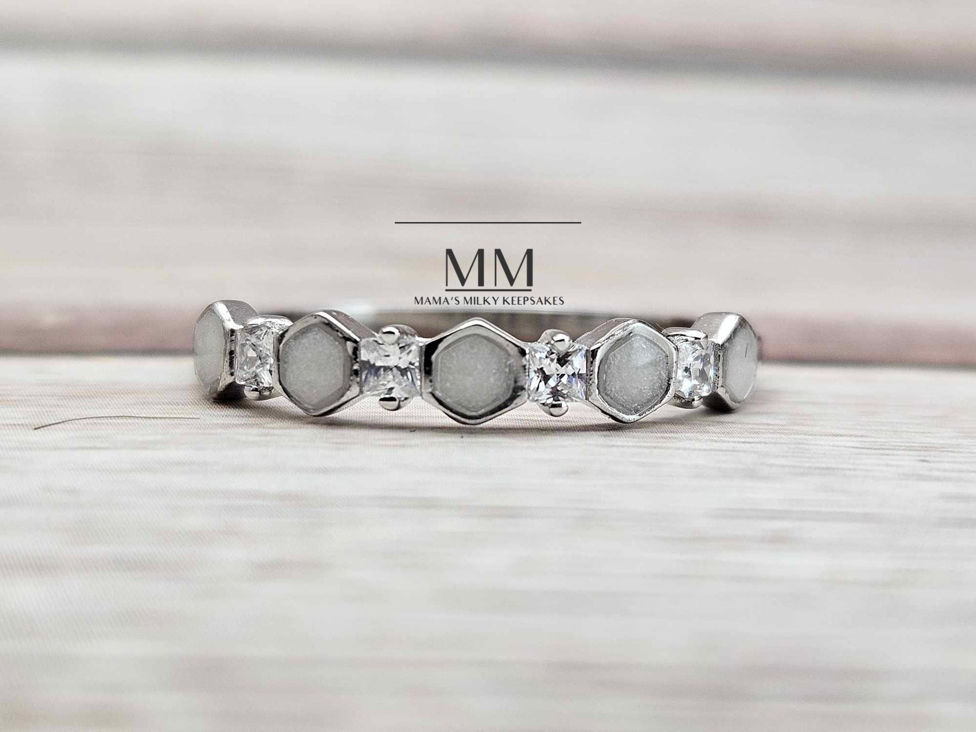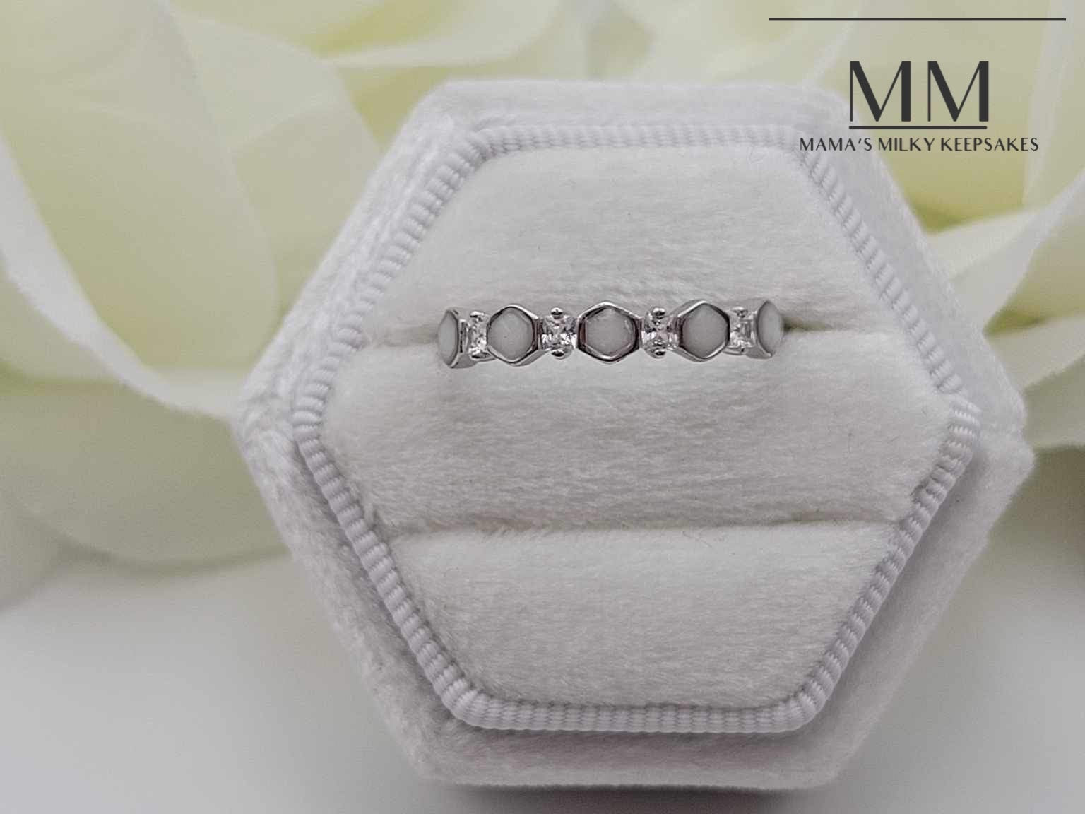 The Tessa ring is made out of solid. 925 sterling silver and white cubic zirconia diamonds. It makes a great stacking ring. Tiny hexagon milk or ash stones fill the openings on the ring.