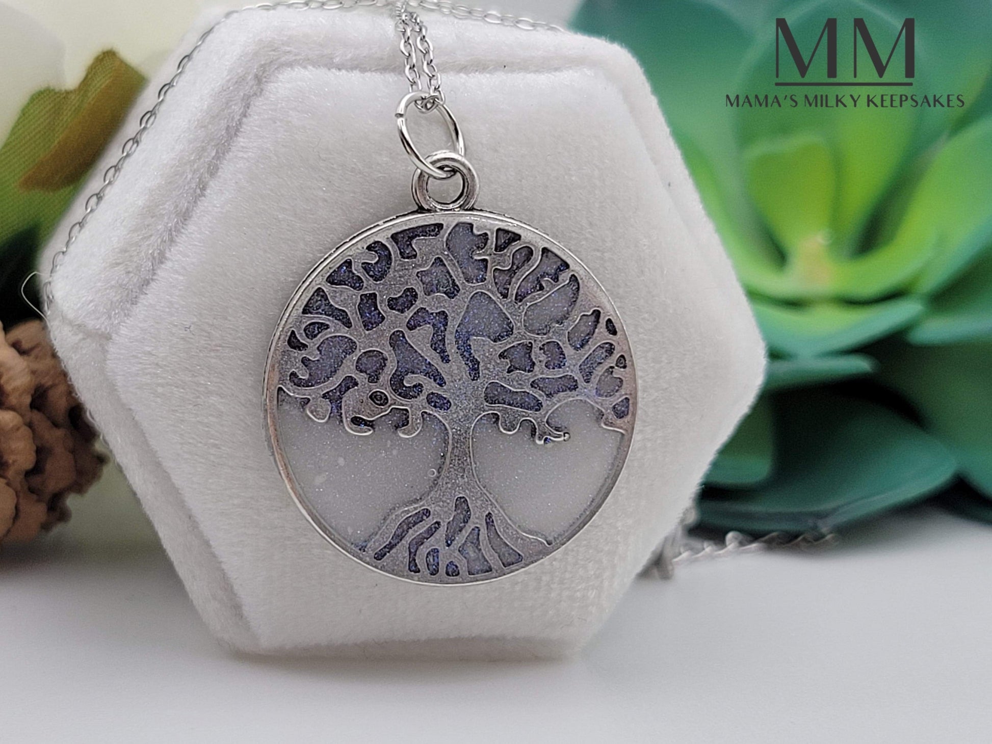 This 28 mm tree of life necklace pendant is filled with milk stones throughout the entire pendant.