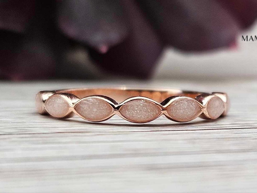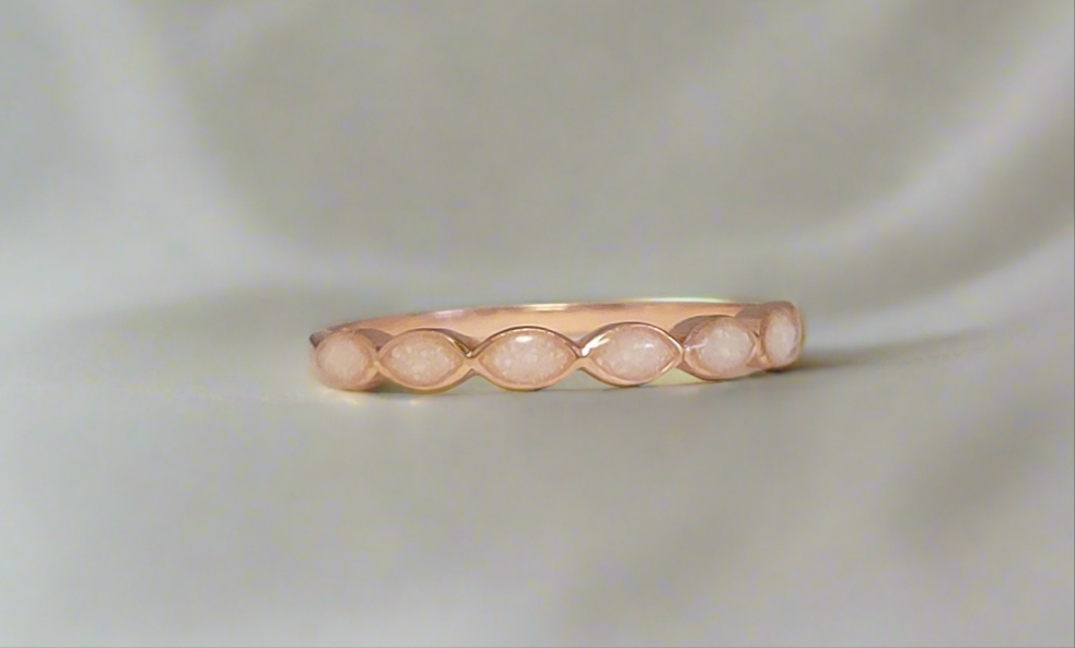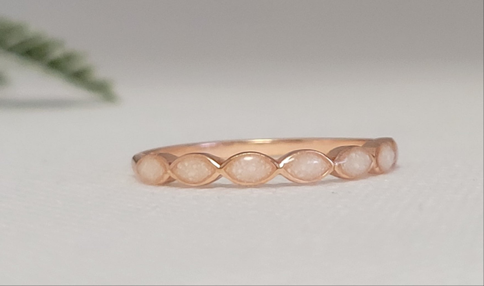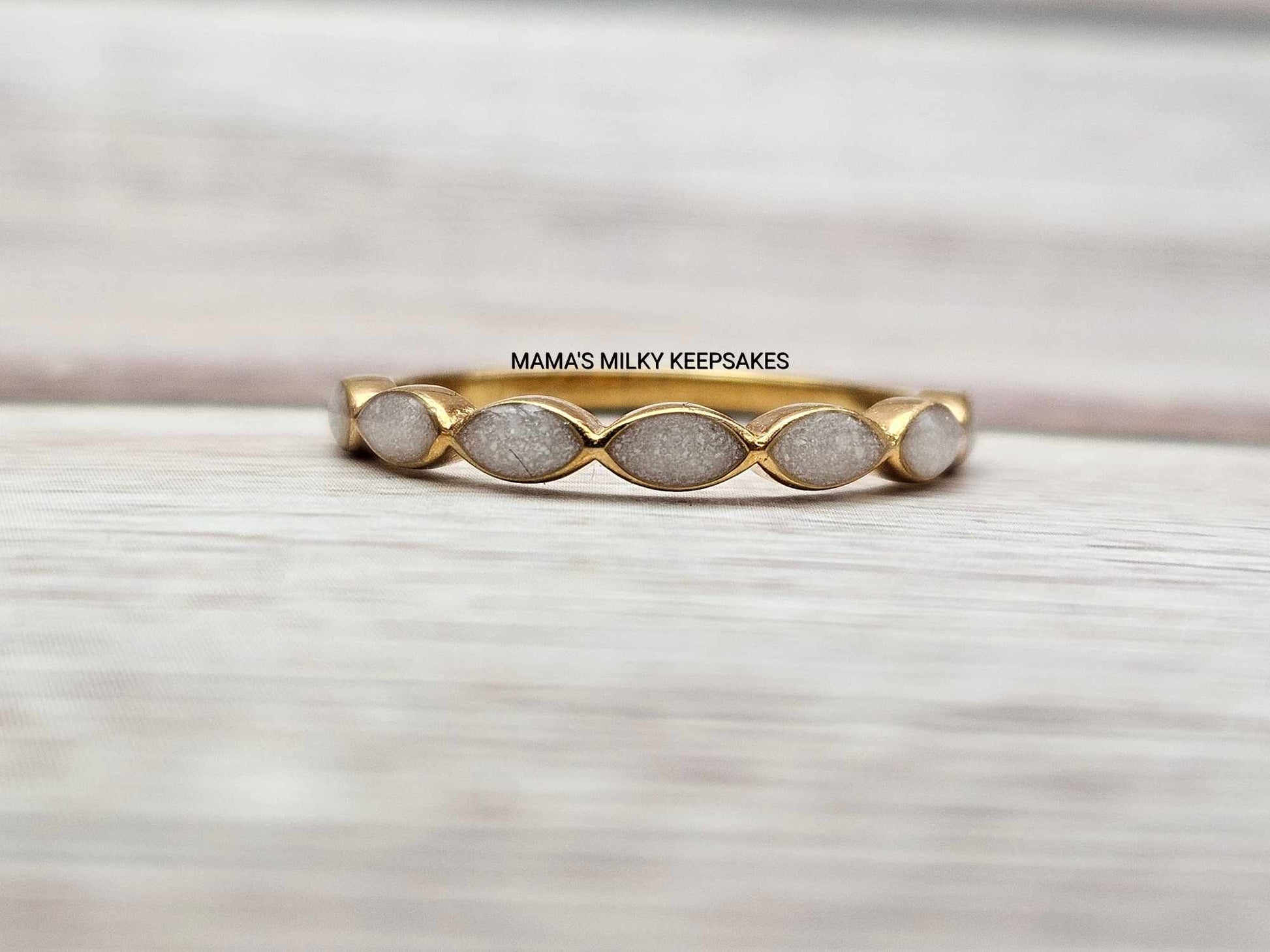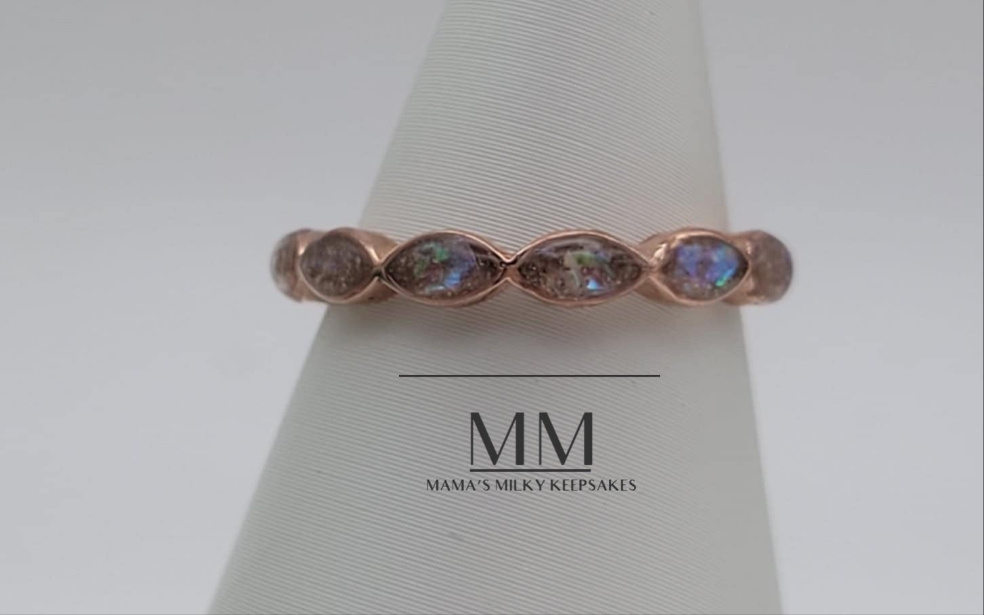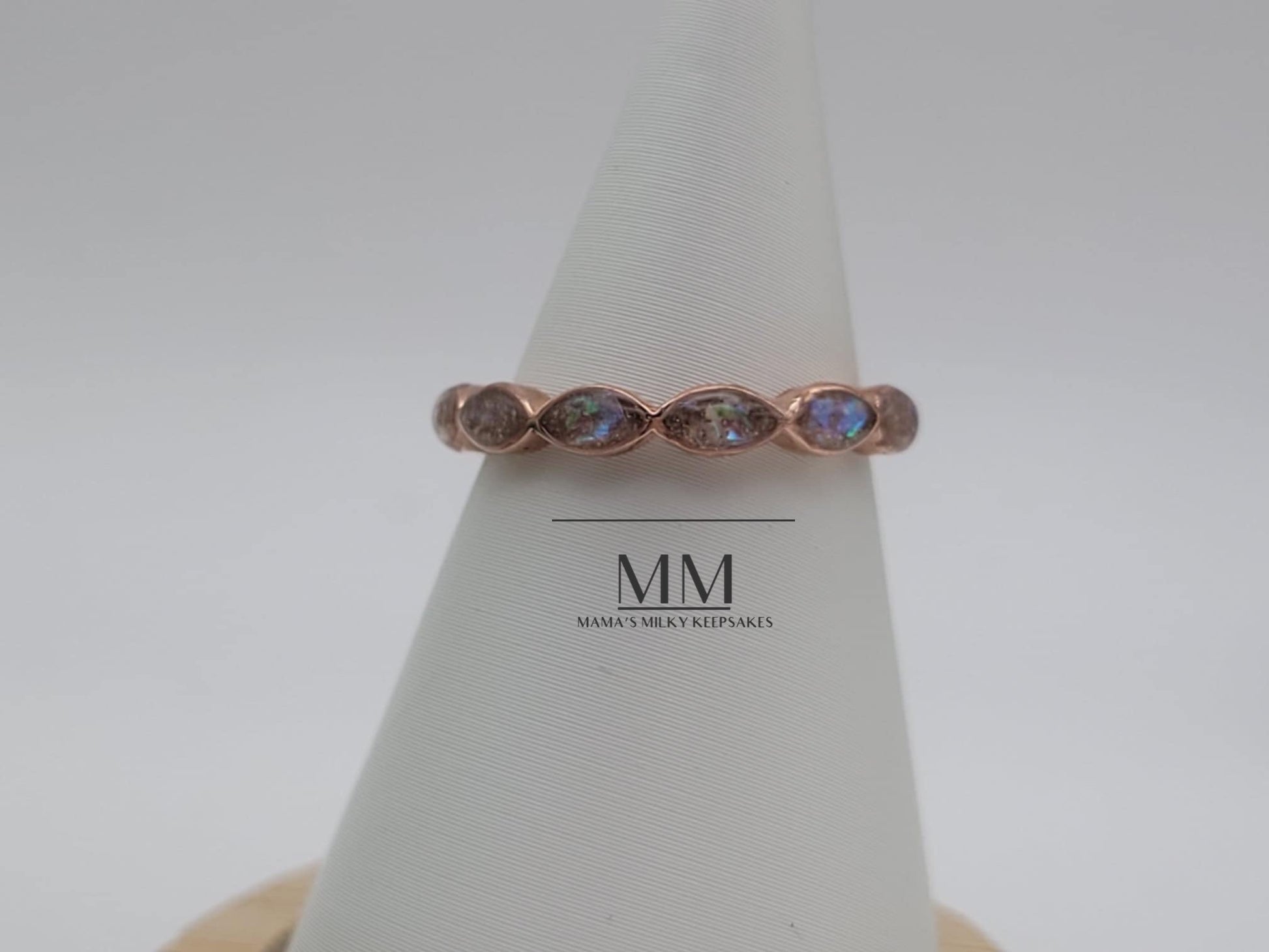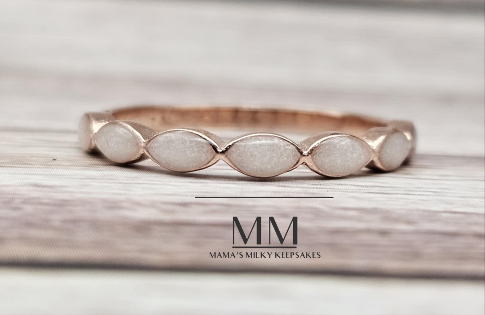 This beautiful ring is made out of solid .925 sterling silver. It also comes in plated rose gold or yellow gold. It holds 2 x 4 mm marquise shaped milk or ash / cremation stones.