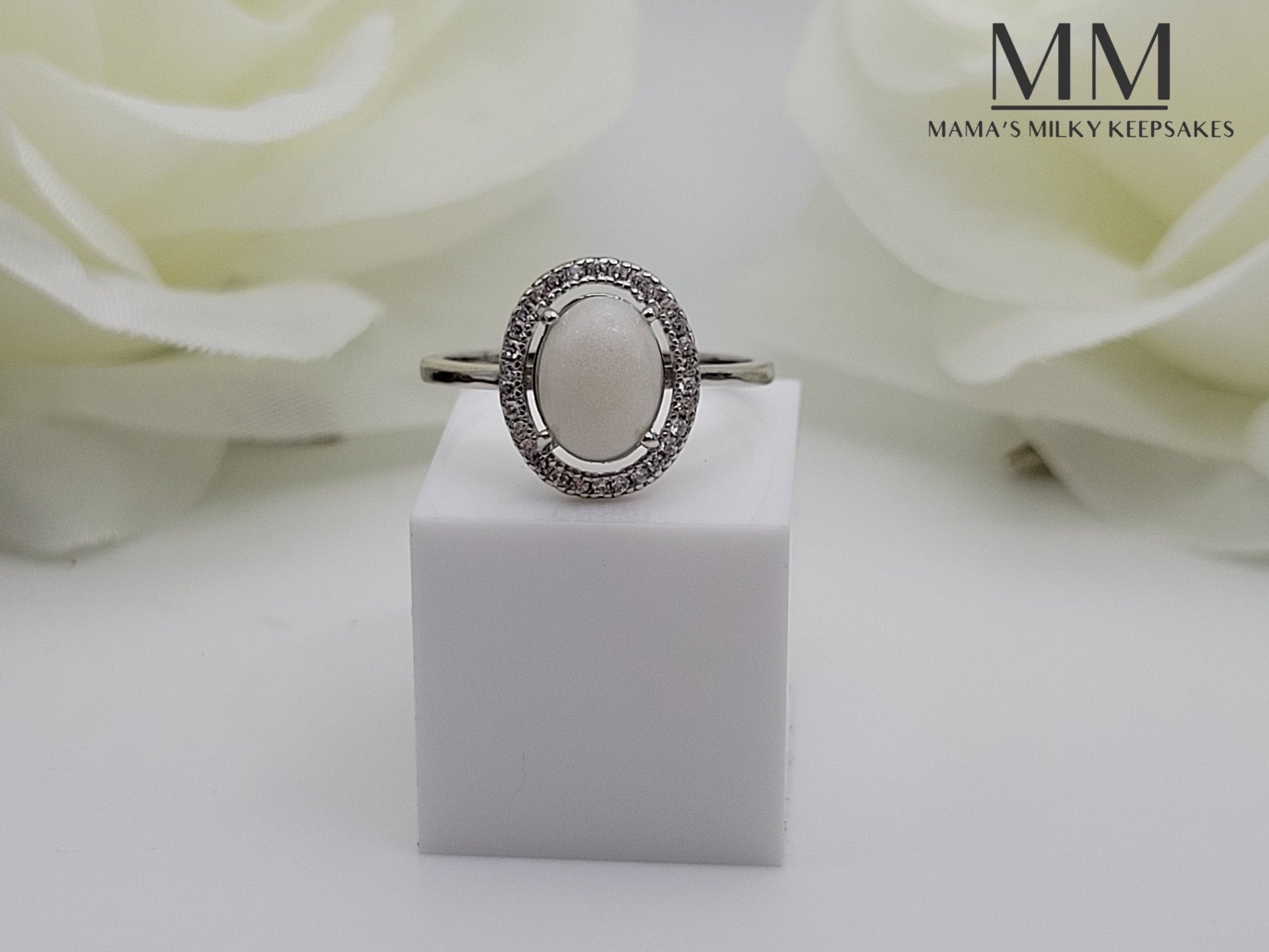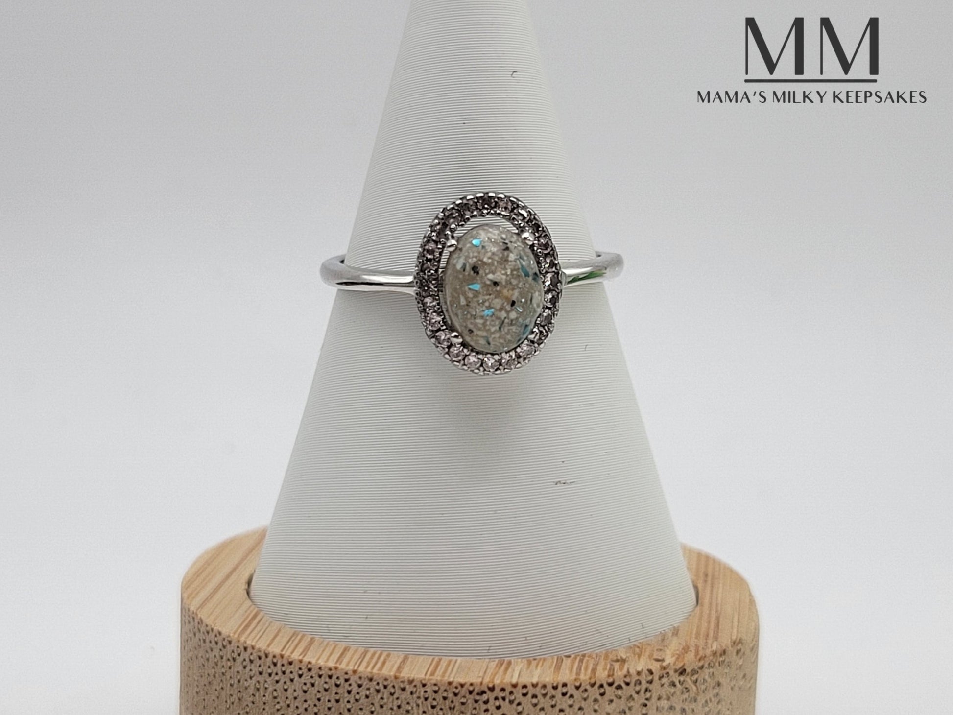 ♡ This ring holds a 6 x 8 mm pear stone made with your inclusions, this piece can hold anything you want it to hold including breastmilk, ashes, formula, hair, pet hair, pet ashes, (not limited to dogs, cat, horses, send me a message!), gravesite soil, dried flowers, umbilical cord, encapsulated placenta, fabric, etc.