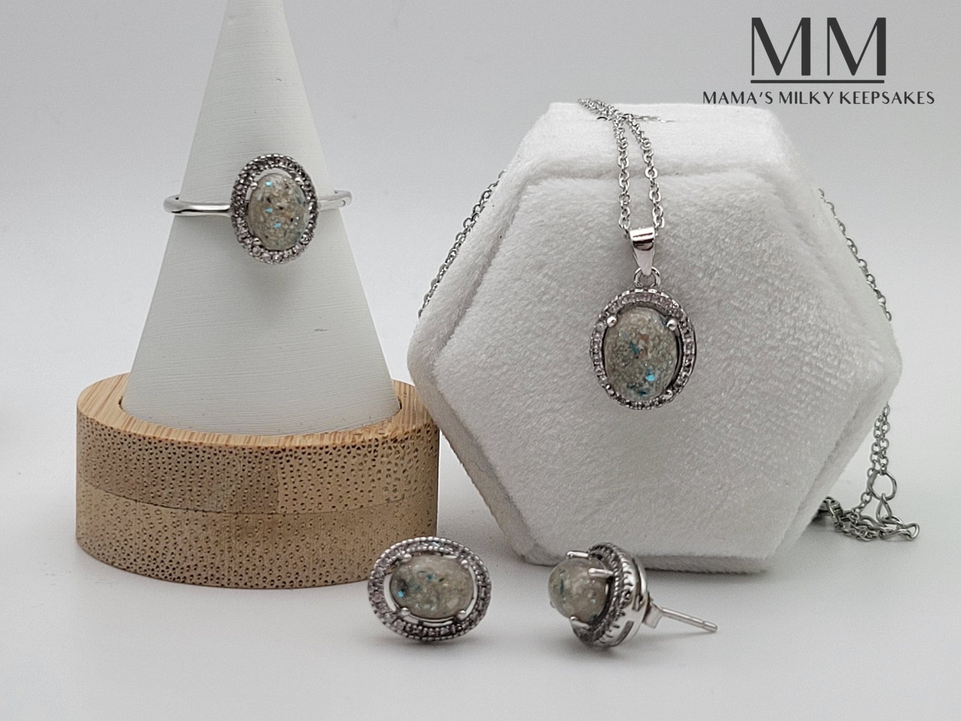I can add whatever you want, into whatever piece you want. Ashes, formula, and soil work just the same as breastmilk so you are not limited to the piece(s) you can choose. For hair, fabric, flowers, etc I recommend choosing something with a bigger main stone and nothing like a stacking ring, so you can see your inclusions especially if you want it shaped any certain way or to see any particular pattern, lace, or texture. This is something we can talk about individually though for sure!