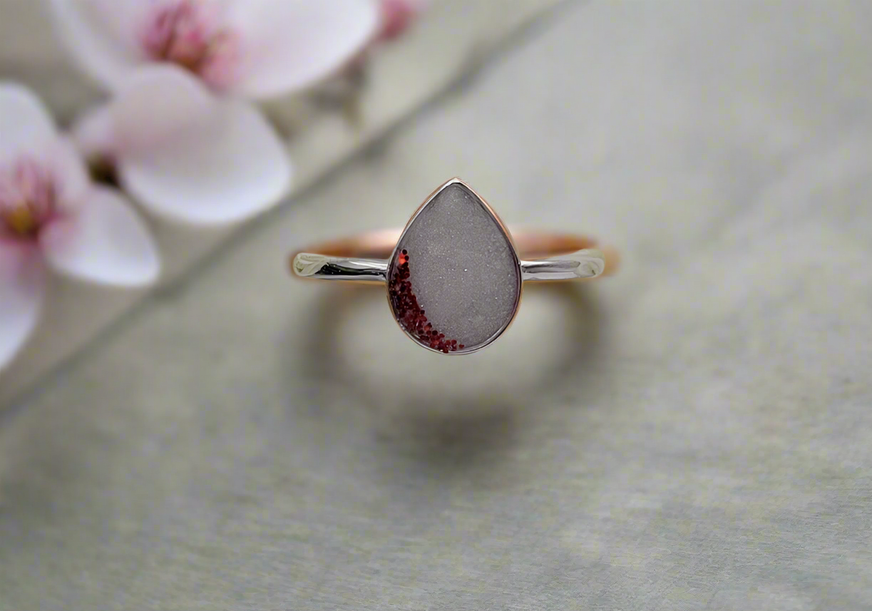 ♡ This ring holds a 7 x 9 mm stone made with your inclusions, this piece can hold anything you want it to hold including breastmilk, ashes, formula, hair, pet hair, pet ashes, (not limited to dogs, cat, horses, send me a message!), gravesite soil, dried flowers, umbilical cord, encapsulated placenta, fabric, etc.